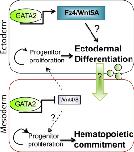 Fig. 8. Model of how GATA2 regulates the balance of Wnt signaling to promote hematopoietic commitment. During normal primitive hematopoiesis, GATA2 induces expression of non-canonical Wnt signaling components, such as Fz4 and Wnt5A in ectodermal cells, and represses expression of the canonical Wnt ligands Wnt4 and Wnt8 in mesodermal cells. Downregulation of canonical Wnt tips the balance away from progenitor proliferation and toward commitment/differentiation. In the mesoderm, this enables progenitors to commit to a hematopoietic fate. In the ectoderm, we hypothesize that differentiation is required for cells to generate a secondary signal (green arrow and circles) that is transmitted to mesodermal cells, enabling them to commit to a blood fate.