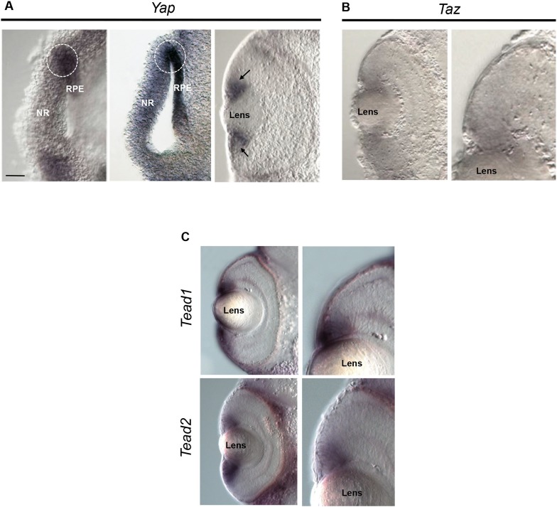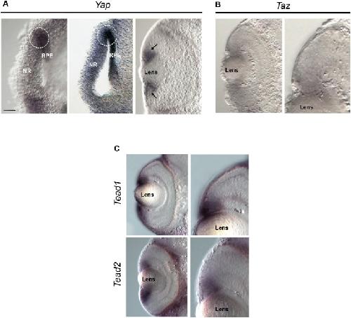 Figure 1âfigure supplement 1. Yap, Taz [=wwtr1] and Tead expression. (A) In situ hybridization analysis of Yap expression on stage 24â25 (left), 26â27 (middle) and stage 35 (right) retinal sections. Yap is expressed in the presumptive neural retina (NR) of the optic vesicle but is more strongly detected in the presumptive retinal pigmented epithelium (RPE), consistently with previous data in fish (Miesfeld and Link, 2014). It also labels the RPE/NR border region (delineated with dotted lines), which is believed to give rise to the CMZ (El Yakoubi et al., 2012). At latter stages, Yap gets restricted to the ciliary margin (black arrows). (B, C) In situ hybridization analysis of Taz (B), Tead1 and Tead2 (C) expression on stage 40 retinal sections. Images on the right are higher magnifications of the ciliary margin. Scale bar = 40 µm. DOI: http://dx.doi.org/10.7554/eLife.08488.004 |