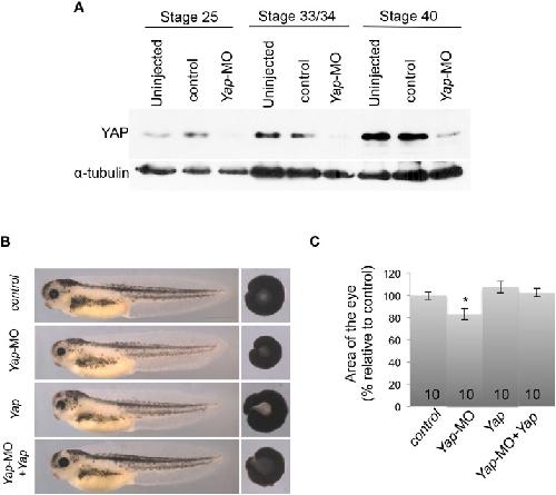 Figure 2âfigure supplement 1. Validation of Yap-MO efficiency and specificity. (A) Western blot analysis showing YAP expression decrease at different stages following microinjection of either Yap-5-mismatch-MO (control) or Yap-MO. α-tubulin is used as a loading control. (B) Lateral views and dissected eyes of stage 40 tadpoles following two-cell stage microinjection of Yap-5-mismatch-MO + Ã-gal mRNA (control), Yap-MO + Ã-gal mRNA (Yap-MO), Yap-5-mismatch-MO + Yap mRNA (Yap), Yap-MO + Yap mRNA (Yap-MO + Yap). (C) Quantification of dissected eye area. The Yap-MO-induced small eye phenotype is rescued by co-injection of Yap mRNA. Of note a suboptimal dose of Yap mRNA was used for the rescue experiment so that it does not alone give any eye phenotype. The number of analyzed tadpoles is indicated for each bar. Scale bar = 1 mm. DOI: http://dx.doi.org/10.7554/eLife.08488.008 |