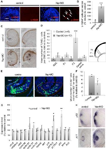 Figure 7. Yap loss of function induces DNA damage.(A) γ-H2AX immunolabeling in the CMZ of retinal sections from stage 40 tadpoles following two-cell stage microinjection of Yap-5-mismatch-MO (control) or Yap-MO. Arrows point to γ-H2AX-positive cells. (B) Corresponding quantification. (C) TUNEL assay on retinal sections from stage 40 tadpoles injected as in (A). Images on the right show higher magnifications of the CMZ delineated with dotted lines. (D) Quantification of TUNEL-positive cells in the different compartments of the CMZ as illustrated on the schematic. (E) 2 days-chase of EdU-labeled cells in the CMZ of stage 42 tadpoles injected as in (A). EdU-positive cells inside the zone encircled with a red dotted line have exited the CMZ (white dotted lines) and integrated the different retinal layers. GCL: ganglion cell layer; INL: inner nuclear layer; PR: photoreceptor layer. (F) Quantification of EdU-positive cells in the neural retina layers. (G) mRNA expression levels of cell cycle genes as measured with the NanoString nCounter system in heads from stage 40 tadpoles following two-cell stage microinjection of Standard MO (control) or Yap-MO. Data are the mean of four independent experiments. (H) In situ hybridization analyses of p53 and p21 expression on retinal sections from stage 40 tadpoles injected as in (A). The number of analyzed retinas per condition is indicated in each bar (B, F) or on the graph (n in D). Data are represented as mean ± SEM. Scale bar = 40 µm.DOI: http://dx.doi.org/10.7554/eLife.08488.014 |