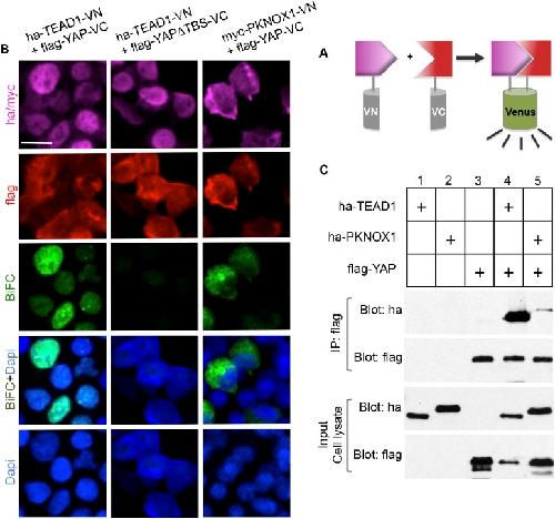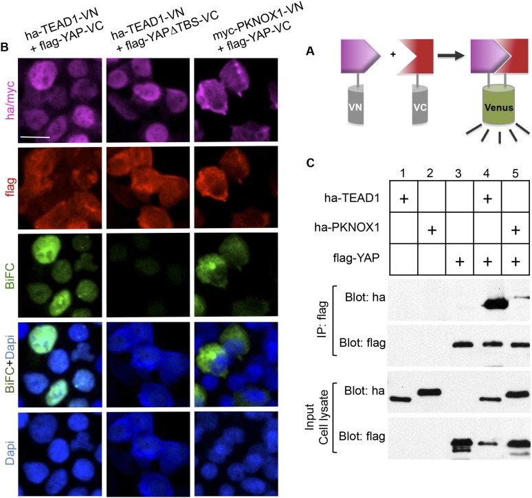 Figure 8. Physical interaction between YAP and PKNOX1.(A) Schematic representation of BiFC principle. (B) Immunolabeling/BiFC analysis on HEK293T cells transfected with VN and VC chimeric constructs, as indicated. (C) Co-immunoprecipitation assay of 293T cells transfected with tagged constructs as indicated. Scale bars = 20 µm.DOI: http://dx.doi.org/10.7554/eLife.08488.015 |