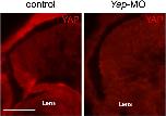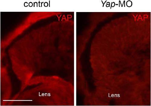 Figure 1âfigure supplement 2. Validation of YAP antibody specificity.Immunostaining with anti-YAP antibody on retinal sections from stage 42 tadpoles following microinjection of either Yap-5-mismatch-MO (control) or Yap-MO. YAP is undetectable in Yap morphants. Scale bar = 40 µm.DOI: http://dx.doi.org/10.7554/eLife.08488.005 |