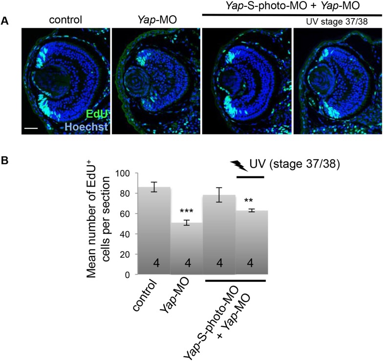 Figure 3âfigure supplement 1. Inducible Yap knockdown at post-embryonic stages reduces EdU incorporation in the CMZ. (A) EdU incorporation assay (3-hr pulse) analyzed on retinal sections from stage 41 tadpoles following two-cell stage microinjection of Yap-5-mismatch-MO (control), Yap-MO and/or Yap-S-photo-MO, as indicated in the table. (B) Quantification of EdU-positive cells within the CMZ. Conditional Yap knockdown by light exposure from stage 37/38 onwards is sufficient to reduce EdU incorporation. The total number of analyzed retinas per condition is indicated in each bar. Scale bar = 40 µm. |