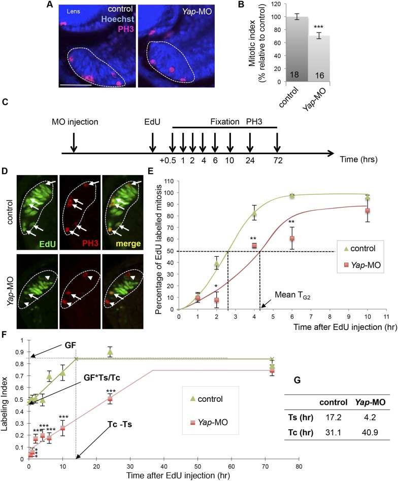 Figure 4. Yap loss of function slows down cell cycle kinetics of retinal stem cells.(A) PH3 immunolabeling on retinal sections from stage 40 tadpoles following two-cell stage microinjection of Yap-5-mismatch-MO (control) or Yap-MO. The CMZ is delineated with dotted lines. (B) Quantification of the mitotic index within the CMZ. The number of analyzed retinas per condition is indicated in each bar. (C) Outline of the PLM and EdU cumulative labeling experiments: tadpoles injected as in (A) were fixed at different time points following EdU injection at stage 39. EdU and PH3 labeling was then analyzed on retinal sections. (D) Retinal sections stained for both PH3 and EdU. The CMZ is delineated with dotted lines. Arrows and arrowheads point to PH3+/EdU+ and PH3+/EdUâ cells respectively. (E) Quantification of the PLM within the whole CMZ. TG2: G2-phase duration. (F) Quantification of the EdU labeling index within retinal stem cells along with increasing EdU exposure times. GF: growth fraction; TC: total cell cycle; TS: S-phase. (G) Estimation of TC and TS. Data are represented as mean ± SEM. Scale bar = 40 µm.DOI: http://dx.doi.org/10.7554/eLife.08488.011 |
