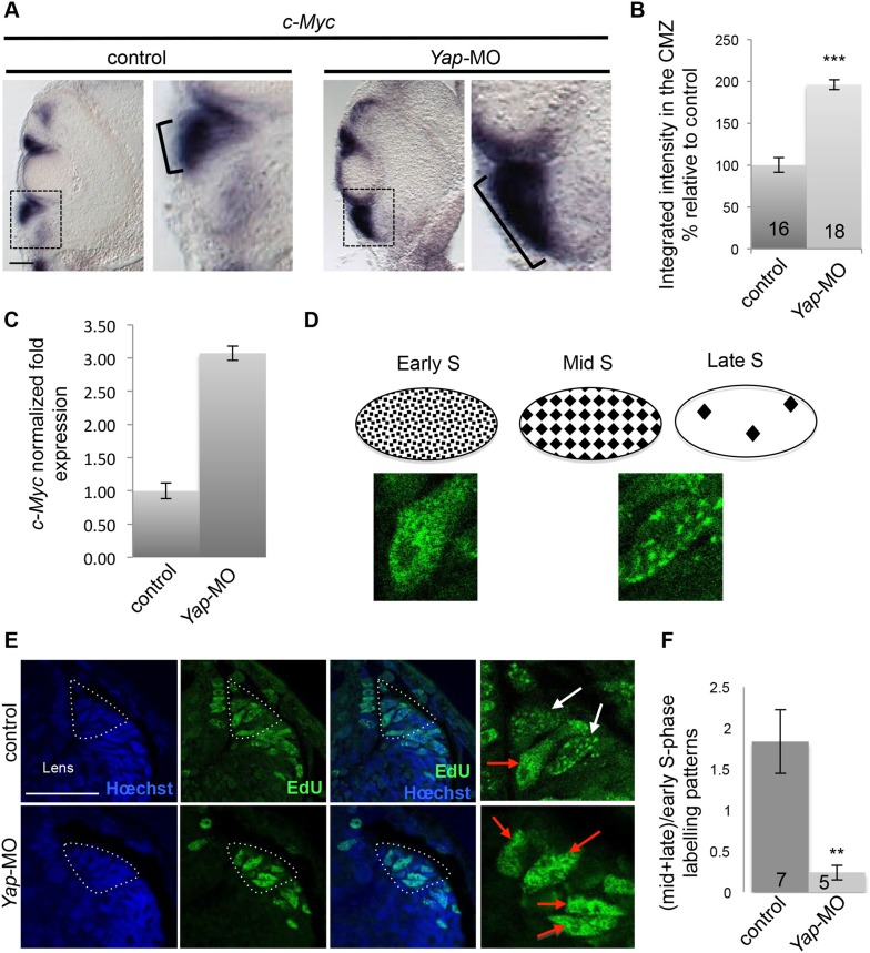 Figure 5. Yap loss of function affects the temporal program of retinal stem cell DNA replication.(A) In situ hybridization analysis of c-Myc expression on stage 40 retinal sections following two-cell stage microinjection of Yap-5-mismatch-MO (control) or Yap-MO. Images on the right show higher magnifications of the CMZ (dotted lines). Note the strong expansion of c-Myc expression area (bracket). (B) Quantification of the staining in the CMZ. The number of analyzed retinal sections per condition is indicated in each bar. (C) qPCR analysis of c-Myc expression in the retina of tadpoles injected as in (A). (D) Schematic representation of replication foci observed during S-phase progression, as inferred from EdU labeling. Pictures illustrate two examples of EdU-labeled foci observed in control CMZ cells, one homogenous (early S-phase) and one with large dots (mid/late S-phase). (E) Analysis of EdU-labeled replication foci (1 hr-pulse) in the CMZ of stage 40 tadpoles injected as in (A). Enlargements of the CMZ tip (dotted lines) are shown on the right. Early (red arrows) and mid/late profiles (white arrows) were distinguished. (F) Corresponding quantification. The number of analyzed retinas per condition is indicated in each bar. Data are represented as mean ± SEM. Scale bar = 40 µm.DOI: http://dx.doi.org/10.7554/eLife.08488.012 |