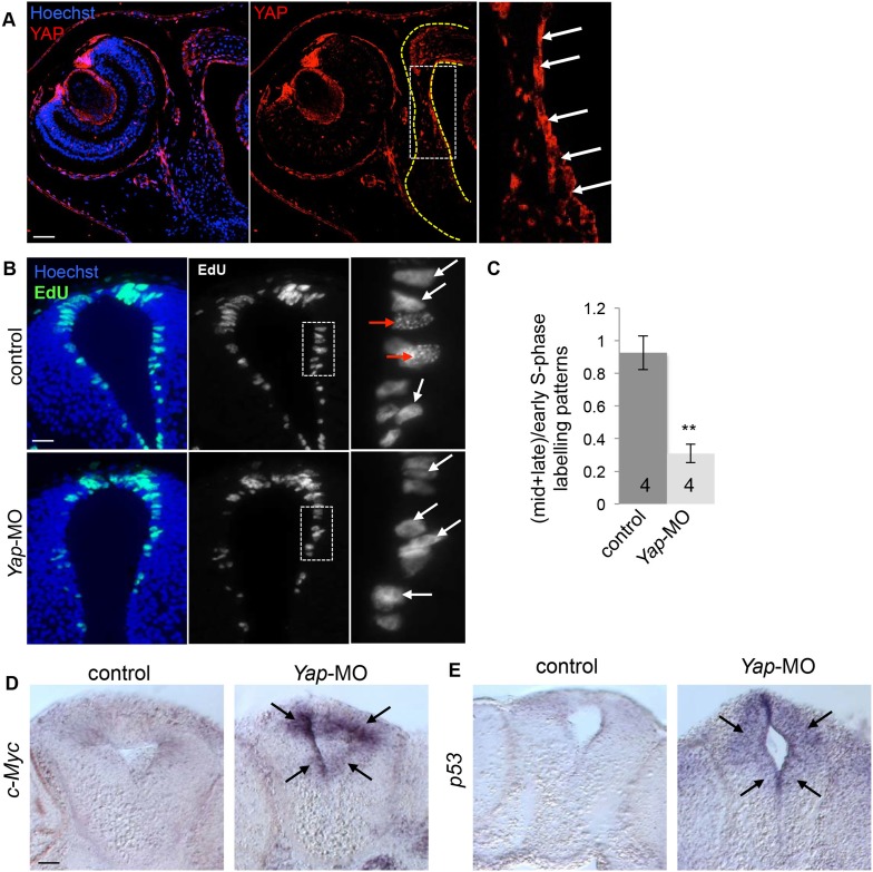 Figure 6. Effects of Yap knockdown in the neural tube.(A) Immunostaining with anti-YAP antibody on stage 42 sections. The left side of the neural tube is delineated with yellow dotted line. A higher magnification of the ventricular zone (white dotted line) is provided in the right panel. YAP labeling is most strongly detected in this region where progenitor cells reside (arrows). (B) Analysis of EdU-labeled replication foci (1 hr-pulse) in the neural tube of stage 40 tadpoles following two-cell stage microinjection of Yap-5-mismatch-MO (control) or Yap-MO. Enlargements (dotted lines) are shown on the right. Early (red arrows) and mid/late profiles (white arrows) were distinguished. (C) Corresponding quantification. The number of analyzed tadpoles per condition is indicated in each bar. Data are represented as mean ± SEM. (D, E) In situ hybridization analysis of c-Myc or p53 expression in the neural tube of stage 40 tadpoles injected as in (B). Note the strong upregulation in the ventricular zone of the neural tube (black arrows). Scale bars = 40 µm.DOI: http://dx.doi.org/10.7554/eLife.08488.013 |