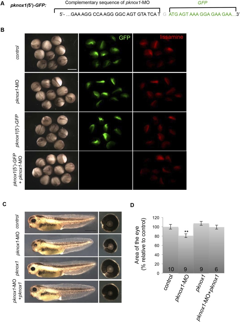Figure 9âfigure supplement 1. Validation of pknox1-MO efficiency and specificity. (A) Schematic representation of the chimeric construct containing GFP downstream of pknox1-MO complementary sequence (pknox1(5â²)-GFP). (B) GFP fluorescence analysis at stage 18 following two-cell stage microinjection of GFP mRNA + pknox1-5-mismatch MO (control), GFP mRNA + pknox1-MO (pknox1-MO), pknox1(5â²)-GFP + pknox1-5-mismatch-MO (pknox1(5â²)-GFP) or pknox1(5â²)-GFP + pknox1-MO. Fluorescence imaging at 594 nm detects the MO-bound lissamine tag. pknox1-MO efficiently inhibits GFP translation of pknox1(5â²)-GFP mRNA. (C) Lateral views and dissected eyes of stage 40 tadpoles following two-cell stage microinjection of pknox1-5-mismatch-MO + Ã-gal mRNA (control), pknox1-MO + Ã-gal mRNA (pknox1-MO), pknox1-5-mismatch-MO + pknox1 mRNA (pknox1), pknox1-MO + pknox1 mRNA (pknox1-MO + pknox1). (D) Quantification of dissected eye area. The pknox1-induced small eye phenotype is rescued by co-injection with pknox1 mRNA. The number of analyzed tadpoles is indicated for each bar. Scale bar = 1 mm. |