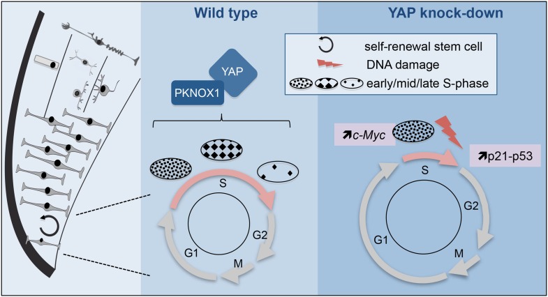 Figure 10. Model illustrating YAP function in retinal stem cells.We found that YAP is expressed in CMZ retinal stem cells (left panel). The middle panel shows the cell cycle of wild type retinal stem cells and the putative role of the YAP/PKNOX1 complex in the control of S-phase temporal progression (represented by the distinct patterns of DNA replication foci). YAP knock-down (right panel) leads to a dramatic reduction of S-phase length likely due to c-Myc-dependent premature firing of late replication origins. This results in increased occurrence of DNA damage, enhanced p21 and p53 expression and eventually cell death.DOI: http://dx.doi.org/10.7554/eLife.08488.018 |