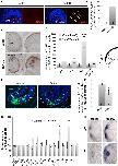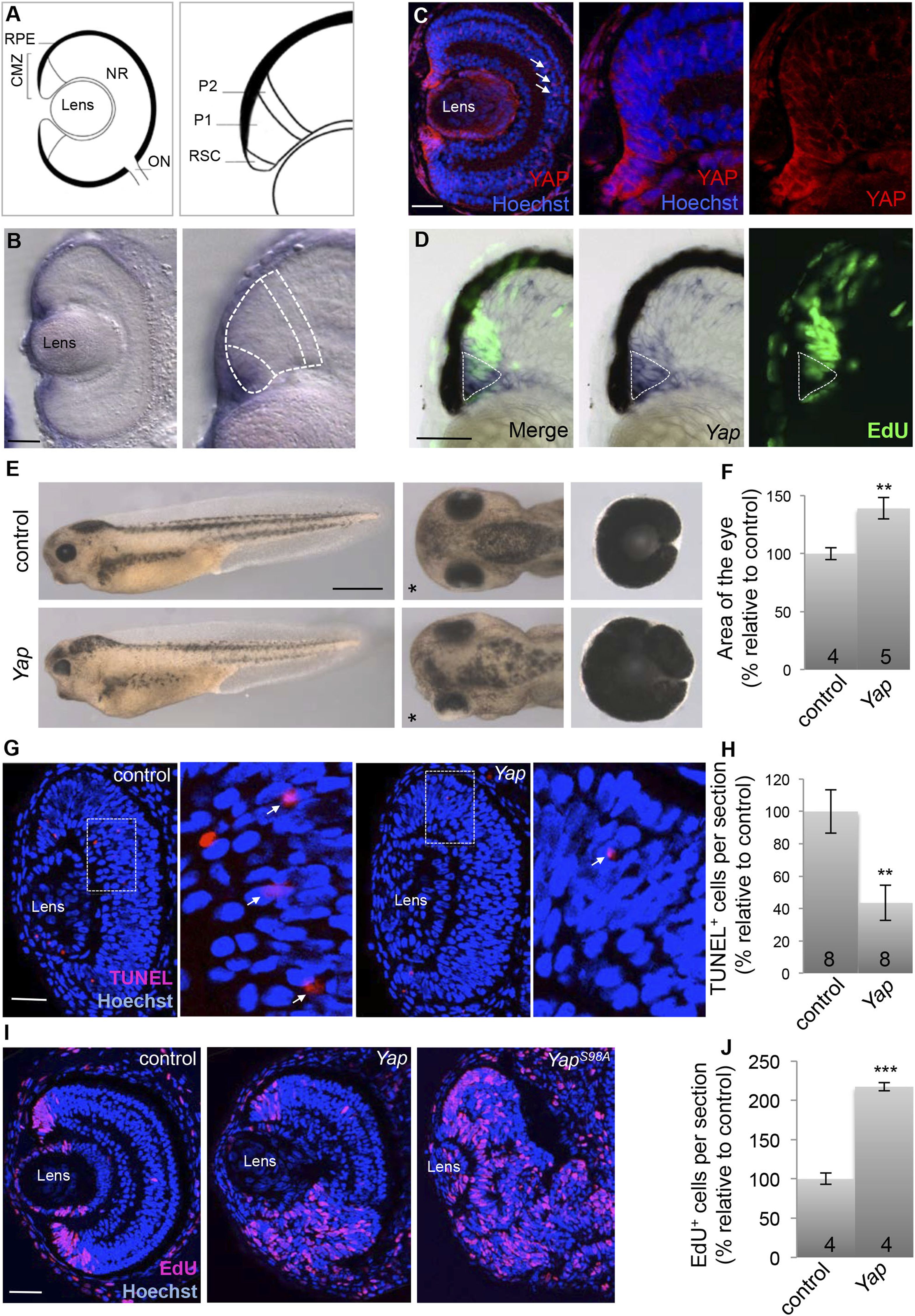 Figure 1. Yap overexpression expands the proliferating cell population in the post-embryonic retina. (A) Schematic transversal section of a Xenopus tadpole retina (RPE: retinal pigment epithelium; NR: neural retina; ON: optic nerve). Within the CMZ (right panel), retinal stem cells (RSC) reside in the most peripheral margin while actively dividing progenitors (P1) and their post-mitotic progeny (P2) are localized more centrally. (B) In situ hybridization analysis of Yap expression on stage 40 retinal sections. The image on the right is a higher magnification of the CMZ (dashed lines represent the different zones as in a). (C) Immunostaining with anti-YAP antibody on stage 42 retinal sections. YAP labeling is detected in the CMZ as well as in Müller glial cells (arrows). Images on the right are higher magnifications of the CMZ. (D) EdU labeling (3-hr pulse) following in situ hybridization with a Yap probe (dotted line) on stage 40 retinal sections. (E) Lateral views (left panels), head dorsal views (middle panels) and dissected eyes (right panels) of stage 40 tadpoles following two-cell stage microinjection of GFP mRNA as a lineage tracer with either Ã-gal (control) or Yap mRNA. The asterisk indicates the injected side. (F) Quantification of dissected eye area. (GâJ) TUNEL (G, H; stage 33/34) or EdU incorporation (I, J; 3-hr pulse at stage 40) assays analyzed on retinal sections from tadpoles injected as in (E). Arrows point to TUNEL-positive cells in higher magnifications of the area delineated with dotted line (G). The number of analyzed retinas is indicated in each bar. Data are represented as mean ± SEM. Scale bar = 1 mm in (E) and 40 µm in other panels. DOI: http://dx.doi.org/10.7554/eLife.08488.003 |