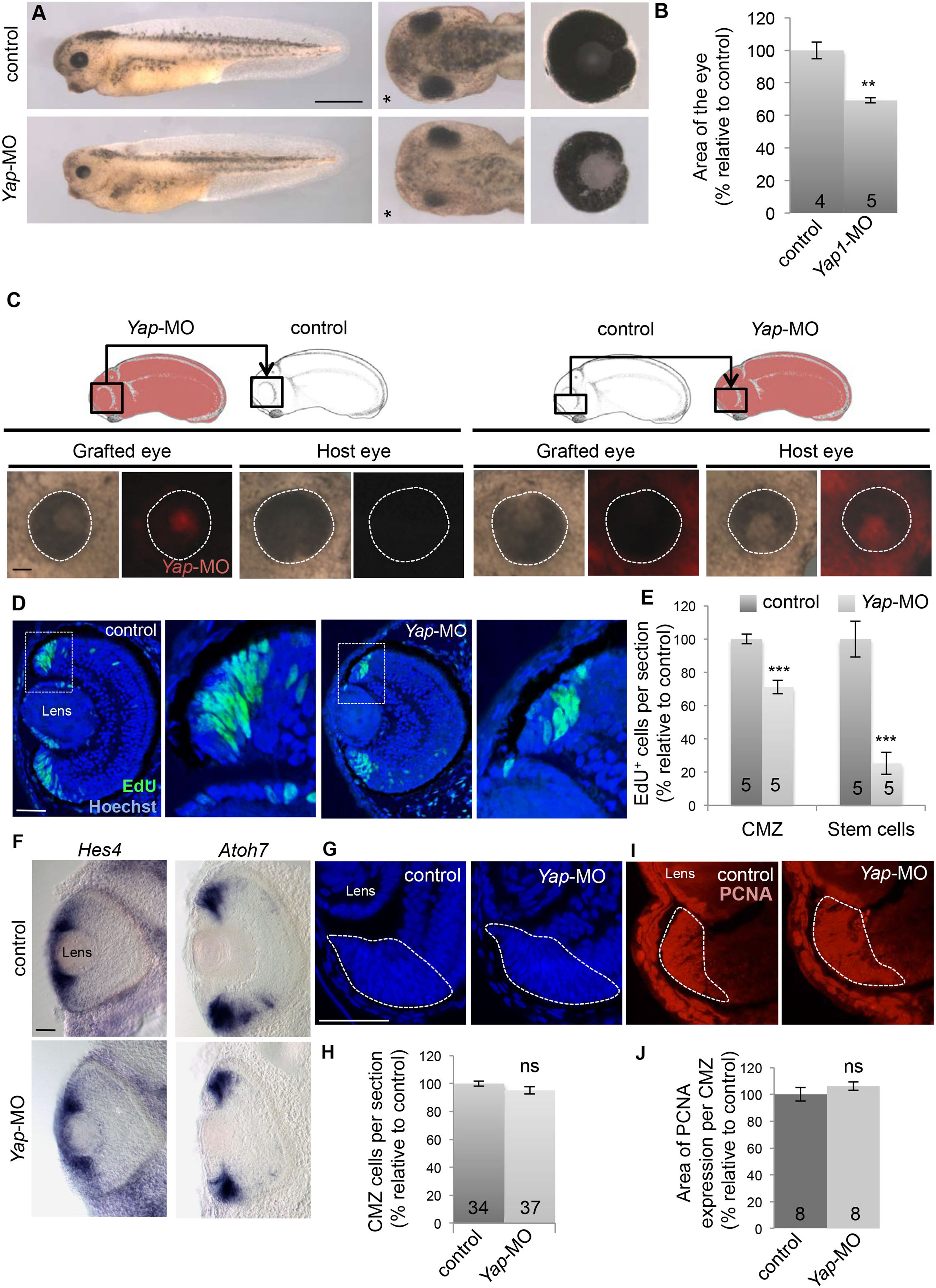 Figure 2. Yap knockdown decreases eye size and EdU incorporation in the post-embryonic retina. (A) Lateral views (left panels), head dorsal views (middle panels) and dissected eyes (right panels) of stage 40 tadpoles following two-cell stage microinjection of Yap-5-mismatch-MO (control) or Yap-MO. The asterisk indicates the injected side. (B) Quantification of dissected eye area. (C) Eyes of stage 40 tadpoles following optic vesicle transplantation at stage 25 as shown in the schematic. Dotted lines delineate the eye circumference. (D) EdU incorporation assay (6-hr pulse) analyzed on retinal sections from stage 40 tadpoles injected as in (A). Higher magnifications of the CMZ (delineated by dotted lines) are shown for each condition. (E) Quantification of EdU-positive cells within the whole CMZ or within the most peripheral stem cell compartment. (F) In situ hybridization analysis of Hes4 (retinal stem cell marker; El Yakoubi et al., 2012) and Atoh7 (progenitor cell marker; Kanekar et al., 1997) expression on stage 40 retinal sections from tadpoles injected as in (A). (GâJ) Hoechst staining and PCNA immunolabeling on stage 40 retinal sections from tadpoles injected as in (A). The CMZ is delineated with dotted lines. The number of analyzed retinas per condition is indicated in each bar. Data are represented as mean ± SEM. Scale bar = 1 mm in (A) and 40 µm in other panels. DOI: http://dx.doi.org/10.7554/eLife.08488.007 |