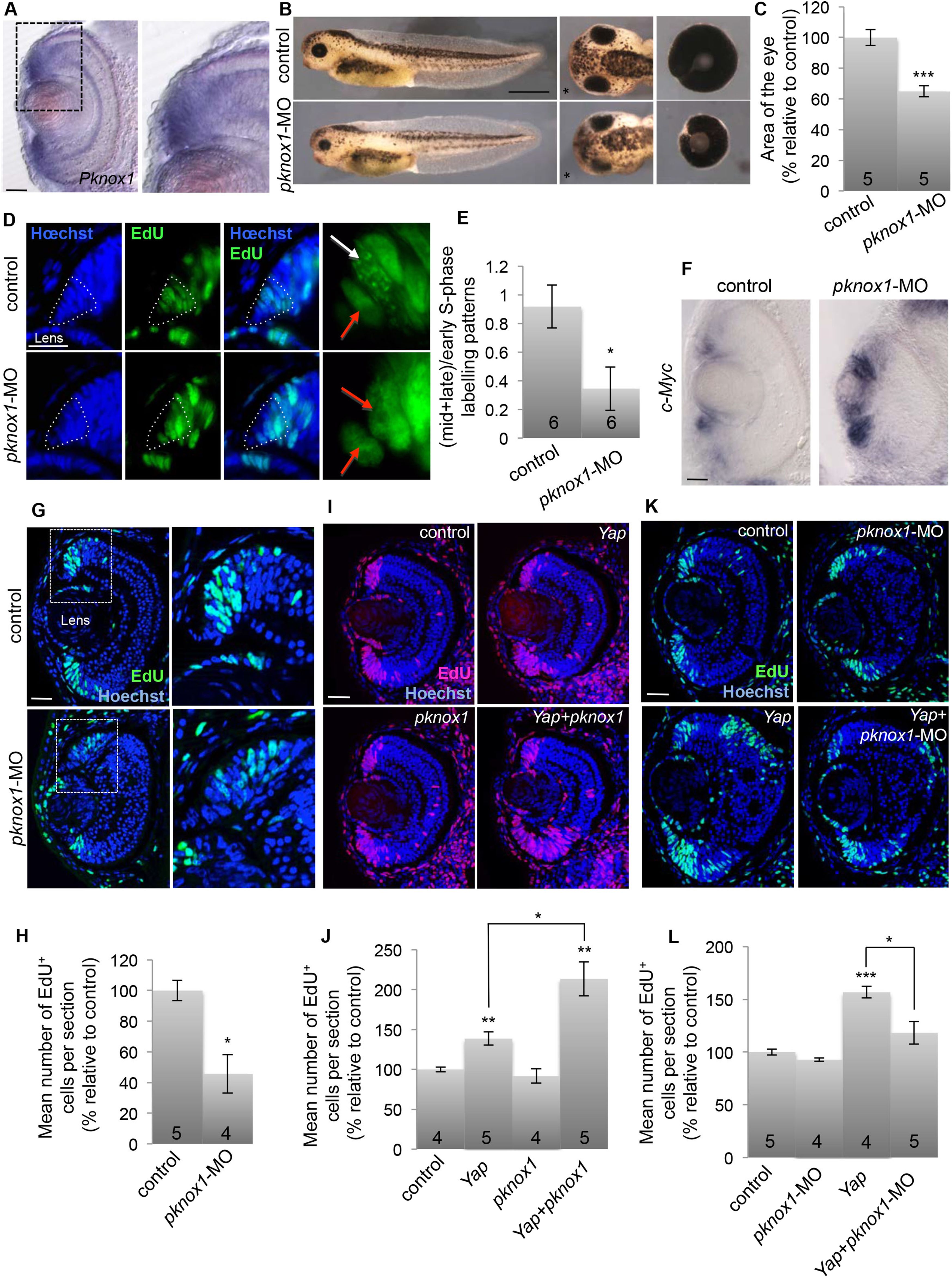 Figure 9. Functional interaction between YAP and PKNOX1. (A) In situ hybridization analysis of pknox1 expression on stage 40 retinal sections. The right panels shows an enlargement of the CMZ region delineated with dotted lines. (B) Lateral views (left panels), head dorsal views (middle panels) and dissected eyes (right panels) of stage 40 tadpoles following two-cell stage microinjection of pknox1-5-mismatch-MO (control) or pknox1-MO. The asterisk indicates the injected side. (C) Quantification of dissected eye area. (D) Analysis of EdU-labeled replication foci (45 min-pulse) in the CMZ of tadpoles injected as in (B). Enlargements of the CMZ tip (dotted lines) are shown on the right. Early (red arrows) and mid/late profiles (white arrows) were distinguished. (E) Corresponding quantification. (F) In situ hybridization analysis of c-Myc expression on stage 40 retinal sections from tadpoles injected as in (B). (GâL) EdU incorporation assays (3-hr pulse) analyzed on retinal sections from stage 40 tadpoles. (G, H) shows the effect of pknox1 knockdown (injection of pknox1-5-mismatch-MO (control) or pknox1-MO). (I, J) shows the synergistic effects of pknox1 and Yap (injection of GFP mRNA and either Ã-gal mRNA (control), Yap + Ã-gal mRNA (Yap), pknox1 + Ã-gal mRNA (pknox1), Yap + pknox1 mRNA (Yap + pknox1)). (K, L) shows the rescue of Yap overexpression by pknox1 knockdown (injection of either pknox1-5-mismatch-MO + Ã-gal mRNA (control), pknox1-MO + Ã-gal mRNA (pknox1-MO), pknox1-5-mismatch-MO + Yap mRNA (Yap), pknox1-MO + Yap mRNA (Yap + pknox-MO)). Of note, a suboptimal dose of pknox1-MO was used for the rescue experiment so that it does not alone give any eye phenotype. The total number of analyzed retinas per condition is indicated in each bar. Scale bar = 1 mm in (B) and 40 µm for all other panels. DOI: http://dx.doi.org/10.7554/eLife.08488.016 |