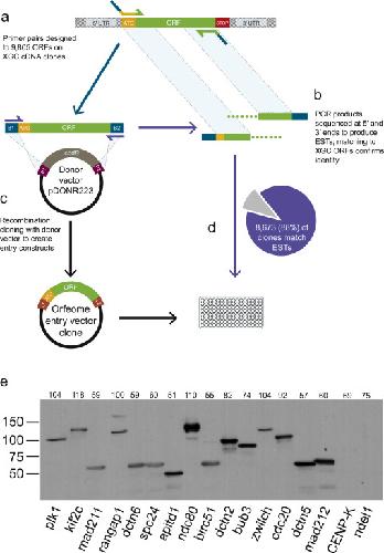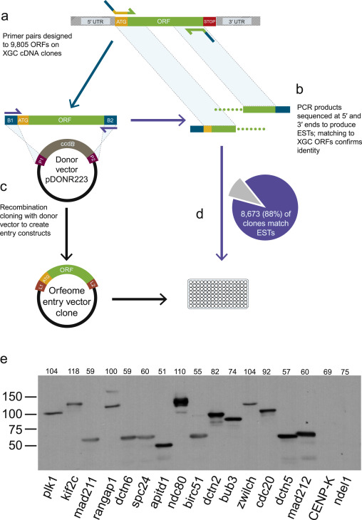 Fig. 1. Schematic overview of generation of the Xenopus ORFeome, v1.0. (a) PCR primers were designed to 9805 ORFs from the XGC cDNA library. (b) The PCR products were EST sequenced at 5â² and 3â² ends, and these sequences were BLASTed against the XGC ORFs. (c) BP recombination cloning reaction with the donor vector, pDONR223 gives the bare ORF in a Gateway entry construct. (d) 8673 Gateway entry clones were consolidated based on confirmation of identity from sequencing to produce Xenopus ORFeome v1.0. (e) Imunoblots of 17 proteins after transfer from Xenopus ORFeome Gateway entry vectors into a C-terminal GFP-tagged destination vector after in vitro translation. The different proteins act as internal controls for each other in this experiment, success is indicated by the relative positions of bands of predicted size, compared to standards (Bio-Rad). Weights are given in kDa, and include 36 kDa for the LAP tag (GFP-TEV-S) fusion. Faint bands may be caused by ribosomes starting at incorrect start sites, or from post-translational modifications. |