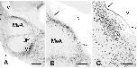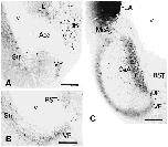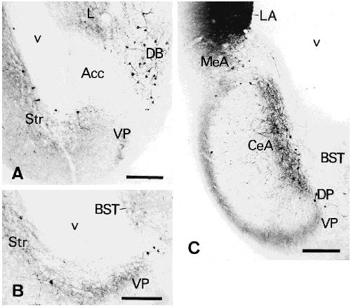cell bodies and fibers at levels of the Acc (A), the ventral pallidum (B), and the CeA (C). Note the
