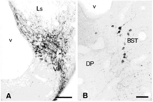 fibers/terminals in the nucleus accumbens (A); in the striatum, ventral