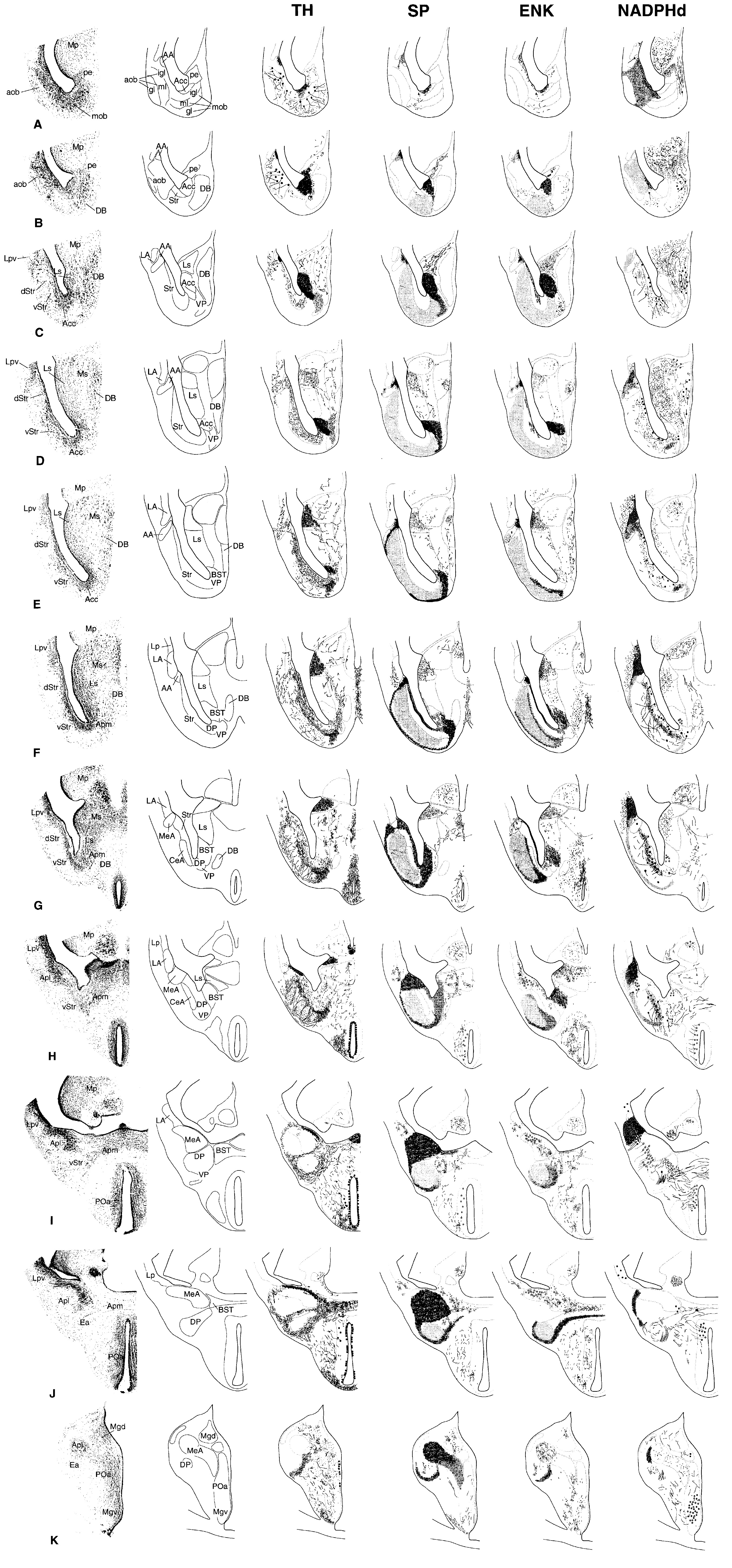 distribution of tyrosine hydroxylase (TH)-, substance P (SP)-, enkephalin