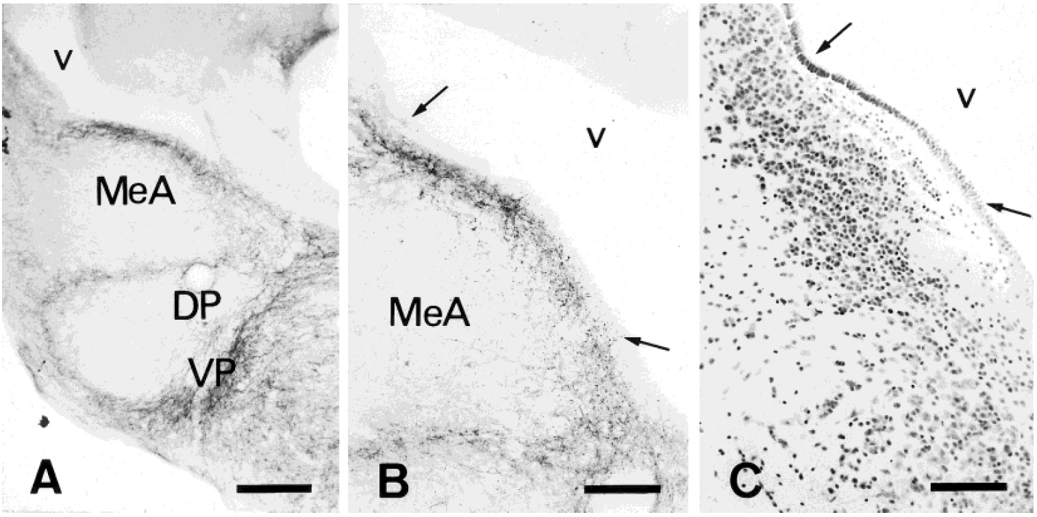 of the MeA in a cell-free zone, as seen in a Nissl-stained section (C).