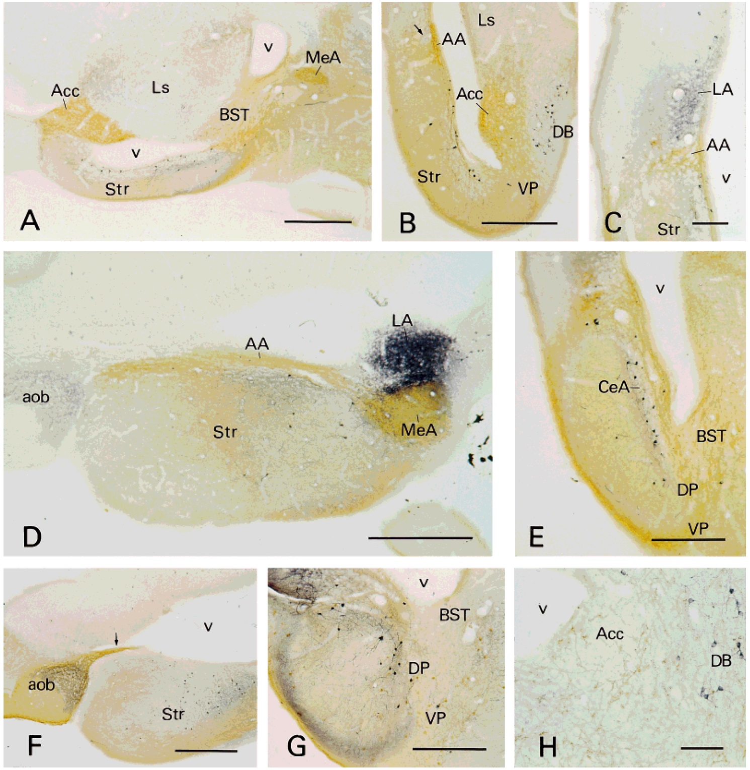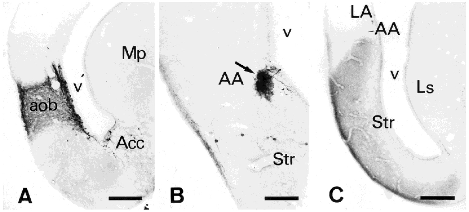 caudal to the accessory olfactory bulb (B), and in the AA and Str at