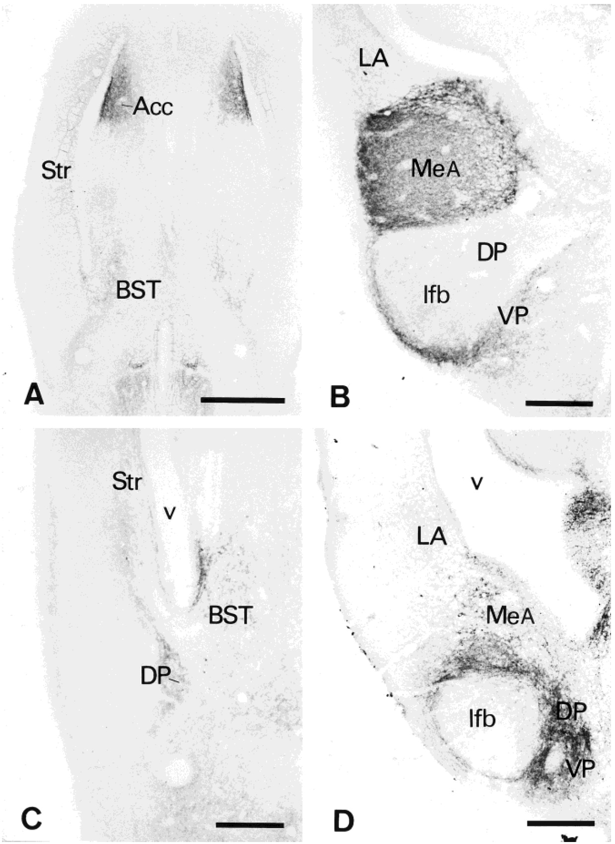 ENK1 cell bodies in the MeA. For abbreviations, see list. Scale bars 5 500 μm in A, 200 μm in B–D.