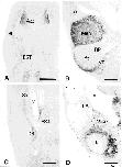 R. perezi. The far left vertical row presents high-contrast photomicrographs