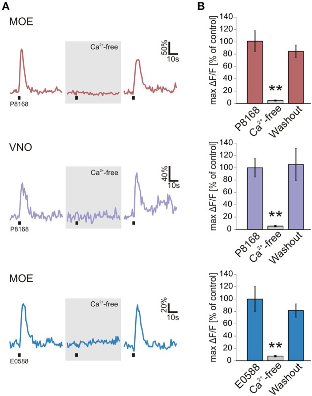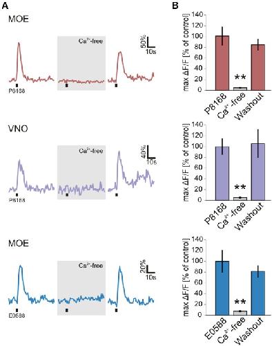 Figure 2. Sulfated steroid-induced calcium transients depend on extracellular Ca2+. (A) Calcium responses of individual neurons to single sulfated steroids (200 μM) are shown. All tested neurons, in both MOE and VNO, showed no response after 3 min incubation in Ca2+-free bath solution. After 3 min of washout, all responses recovered. (B) Mean calcium responses (±SEM), expressed as percentage of control (MOE/P8168, 9 cells, 2 slices; VNO/P8168, 9 cells, 2 slices; MOE/E0588, 9 cells, 6 slices) are shown in standard (colored columns) and Ca2+-free bath solution (gray columns; 3 min after application of Ca2+-free bath solution). All responses were virtually abolished in Ca2+-free bath solution (**p < 0.01; paired Student's t-test).