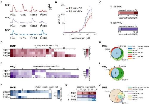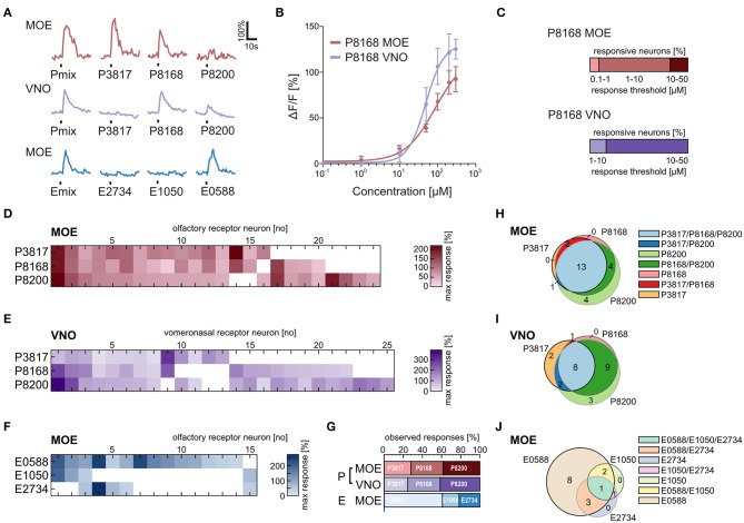 Figure 5. Physiological characterization of sulfated steroid responses. (A) Calcium responses of three sensory neurons upon application of sulfated steroid mixtures and of single compounds from each mixture (200 μM). (B) Concentration-dependent response curves for a single component of the P mix (P8168) in sensory neurons of the MOE (9 cells) and the VNO (8 cells). (C) Graphs showing the percentage of responsive neurons having a certain detection threshold. MOE: 0.1–1 μM, 1 cell; 1–10 μM, 8 cells; 10–50 μM, 2 cells (8 slices). VNO: 1–10 μM, 2 cells; 10–50 μM, 10 cells (6 slices). (D) Response profiles of P steroid-sensitive neurons in the MOE (24 cells, 7 slices; response intensities are coded by a color gradient). (E) Response profiles of P steroid-sensitive neurons in the VNO (25 cells, 5 slices). (F) Response profiles of E steroid-sensitive neurons in the MOE (15 cells, 7 slices). (G) Percentage of observed responses to individual sulfated steroids. P steroids showed a similar trend between MOE and VNO, with all three steroids eliciting between 20 and 40% of the total responses. A different trend was detected for E steroids, with one compound of the mixture (E0588) eliciting more than half (~60%) of the observed responses. (H) Venn diagram showing groups of P mix responsive neurons in the MOE. The majority of the neurons (13 cells) responded to all three components of the mixture. (I) Venn diagram showing groups of P mix responsive neurons in the VNO. The two main groups (9 and 8 cells) include neurons responding to two and three chemicals of the P mix. (J) Venn diagram showing groups of E mix responsive neurons in the MOE. The largest group (8 cells) contains neurons responding to only one chemical in the mixture, namely E0588.