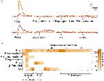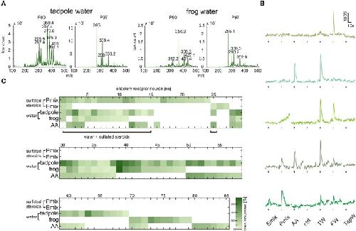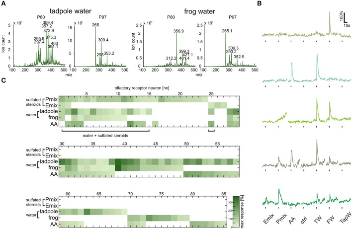 Figure 6. Tadpole and frog breeding water contains sulfated compounds and activates neurons sensitive to synthetic steroids. (A) Following chromatographic extraction of steroids from breeding water, precursor ion scan mass spectrometry was used to analyze the abundance of peaks that fragment to produce negative ions with m/z of 80 (SO3â, left column) or 97 (HSO4â, right column). (B) Representative calcium responses of five MOE neurons. The shown cells include the main subgroups of responding cells, i.e., cells responding to both synthetic steroids (200 μM) and breeding water (1:1 dilution), cells responding to amino acids (100 μM) and breeding water, cells responding to breeding water only, and cells responding to synthetic steroids, breeding water and amino acids. (C) Response matrix of neurons in the MOE responding to breeding water (1:1 dilution) and synthetic sulfated steroids (200 μM; 85 cells, 5 slices). The majority of the neurons responding to synthetic steroids also responded upon application of breeding water (16 out of 27 cells). Response intensity is coded by a color gradient. A mixture of amino acids (AA, 100 μM) was applied as a control for slice viability. TW, tadpole breeding water; FW, frog breeding water; TapW, tap water control; ctrl, bath solution control.