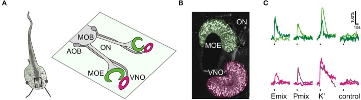 Figure 1. Sulfated steroid-induced calcium responses in the olfactory organ. (A) Schematic of a larval Xenopus laevis (stage: 52–53). The black rectangle outlines the olfactory system. An enlargement of the olfactory system is shown on the right hand side. The main olfactory epithelium (MOE) and the vomeronasal organ (VNO) are connected via the olfactory nerve (ON) to the main olfactory bulb (MOB) and the accessory olfactory bulb (AOB), respectively. (B) Olfactory organ of larval Xenopus laevis visualized by biocytin-streptavidin retrograde labeling of sensory neurons (MOE, green; VNO, magenta). (C) Time courses of sulfated steroid-induced [Ca2+]i transients of individual sensory neurons of the MOE (green traces, 2 different cells) and the VNO (magenta traces, 2 different cells). We recorded a total of 90 P mix-responsive sensory neurons in the MOE (18 slices) and 75 in the VNO (33 slices). We recorded a total of 30 E mix-responsive sensory neurons in the MOE (18 slices) and 5 in the VNO (32 slices). Sulfated steroid mixtures were applied at a concentration of 100–200 μM. All cells responded to high K+ solution, but did not respond upon application of standard bath solution.