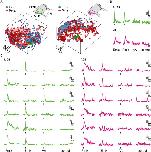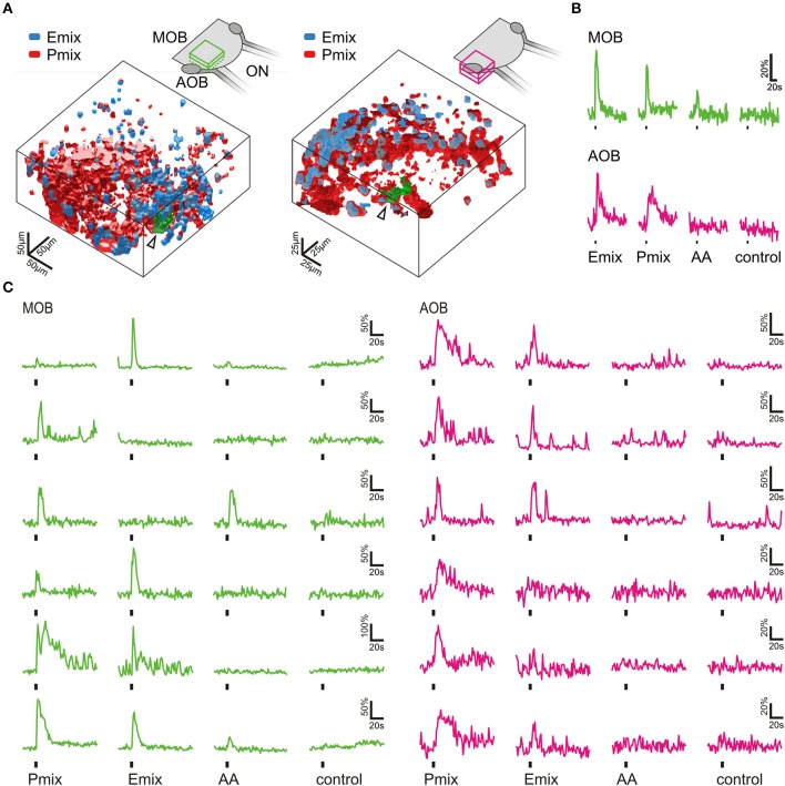Figure 4. Sulfated steroids are processed in the olfactory bulb. (A) 3D rendering of reactive volumes in the MOB (left hand side) and AOB (right hand side) upon mucosal application of E and P mix (E mix-responsive areas, blue; P mix-responsive areas, red). Active regions always contained both cell somata and glomerular structures. Schematics of the olfactory bulb in the upper part show the approximate location of the responsive regions. (B) Calcium responses of the glomerular regions indicated by an arrow and green color in A (MOB, green traces; AOB, magenta traces). Amino acid mixture (AA, 100 μM) was applied as a positive control for activation of the MOB. (C) Representative calcium responses of mitral/tufted cells in the MOB (green) and AOB (magenta) upon mucosal application of sulfated steroids (E mix and P mix, 200 μM) and amino acids (AA, 100 μM). In both main and accessory olfactory bulb, mitral/tufted cells were activated by either E or P steroids, or both stimuli. Amino acids only elicited calcium responses in mitral/tufted cells of the MOB. Similar results were obtained in 4 MOBs and 3 AOBs.