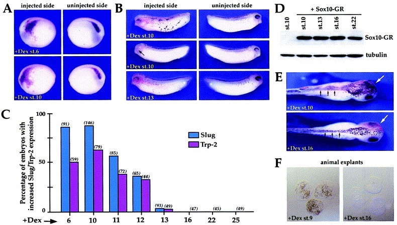 Fig. 6. Sox10 expands Slug and induces ectopic Trp2-expressing cells and melanocytes at the gastrula stage. (A) Ectopic Slug expression in embryos injected with Sox10-GR at the two-cell stage and treated with dexamethasone at stage 6 or stage 10 (left panels). Slug expression on the uninjected side is shown for comparison (right panels). (B) Ectopic Trp-2 expression in embryos injected with Sox10-GR at the two-cell stage and treated with dexamethasone at stage 10 (upper left panel). Trp-2 expression is unaffected in the neural crest lineage of embryos treated with dexamethasone at stage 13 (lower left panel). When targeted in the head region, Sox10-GR blocks Trp-2 expression in the pigmented epithelium of the retina (arrow, left panel). Trp-2 expression on the uninjected side is presented for comparison (right panels). Lateral view, anterior is to the left (left panels) or to the right (right panels). RNA encoding the lineage tracer beta-galactosidase was coinjected to identify the injected side (red staining). (C) Quantification of the in situ hybridization results. The number of cases analyzed for each time point (+Dex) is indicated in parentheses. (D) Western blot analysis. Detection of Sox10-GR protein in extracts from Sox10-GR-injected embryos (+Sox10-GR) collected at different stages after injection at the two-cell stage. The fusion protein is expressed at similar levels at all stages (st 10â22). This Sox10 antibody does not allow detection of endogenous Sox10 protein (first lane). Tubulin is presented as a loading control. (E) Development of ectopic melanocytes in Sox10-GR-injected embryos. Embryos injected with Sox10-GR at the two-cell stage and treated with dexamathasone at stage 10 (upper panel, +Dex st 10) displays ectopic formation of pigment cells in the head (white arrow) and the trunk (black arrows) regions. The pattern of pigment cells is unaffected in sibling embryos treated with dexamethasone at stage 16 (lower panel, +Dex st 16). (F) Induction of differentiated melanocytes in animal explants at equivalent stage 40. Animal explants isolated at the blastula stage from embryo injected with 2 ng of Sox10-GR mRNA at the two-cell stage were treated with dexamethasone at stage 9 (+Dex st. 9) or at stage 16 (+Dex st. 16). Induction of melanocytes is only observed in animal explants treated by dexamethasone at stage 9.