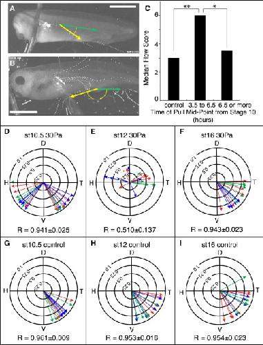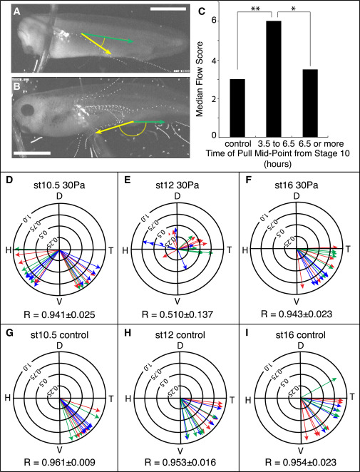 Figure 6. Exogenous Strain Alters Flow and Ciliated Cell Orientation in Embryos(AâC) Embryos at different stages were subjected to exogenous strain by suction into a capillary tube for approximately 4 hr (Movie S3), allowed to recover overnight, and then tested for flow by evaluating bead movement over the ventral half of the trunk, measuring the angle between the A-P axis (green arrow) and the bead trajectory (yellow arrow) such that posterior flow is 0° and ventral flow is 90°. Shown are examples of flow at 26° (A) and 164° (B). Bead flow was analyzed based on a rubric that scores the deviation from normal angle and the extent of the trunk over which aberrant flow occurred. Embryos sucked between approximately stages 11 and 14 showed significantly higher deviation from normal flow than did control (unsucked) embryos (C) based on a Mann-Whitney U test (âp < 0.05, ââp < 0.01). The scale bars represent 1 mm.(DâI) Embryos were drawn into a 0.7-mm capillary (Movie S4) using 30 Pa of negative pressure for 4 hr at st10.5 (D and G), st12 (E and H), or st16 (F and I) and then released to recover overnight. At stage 29, embryos were fixed and ciliated cell orientation was measured using the assay described in Figure 3, focusing on cells both in the pressure-applied region (DâF) and on the opposite untreated side as a control (GâI). Data are represented on polar plots with head (H), tail (T), dorsal (D), and ventral (V) indicated, where the average direction of cilia in an MCC is represented by an arrow whose length equals 1 minus the circular variance. R equals the average length of the arrows in each sample. Three embryos were analyzed at each stage, measuring cilia orientation in five to ten cells for each embryo on both sides.