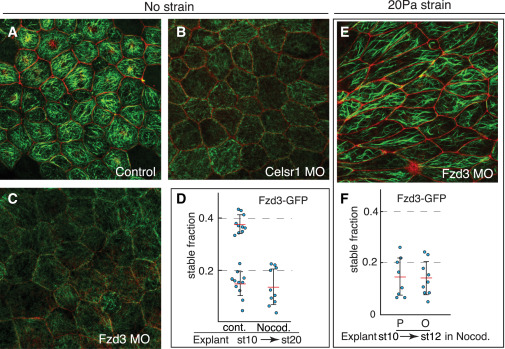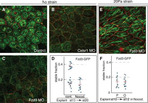 Figure 7. Interactions between PCP, MTs, and Strain in Explants(AâC) Ectodermal explants were generated at stage 10 from control embryos (A) or celsr1 (B) and fzd3 morphants (C), and injected at the two-cell stage with RNAs encoding EMTB-GFP or mRFP to label MTs (green) and cell membranes (red), respectively. Shown are representative images taken by confocal microscopy of explants after treatment with 5 μM Taxol to stage 21.(D) Ectodermal explants were generated at stage 10 from embryos injected with RNA encoding Fzd3-GFP, and cultured to stage 20 in the presence and absence of 1 μg/ml nocodazole. At stage 20, the fraction of stable Fzd3-GFP was determined at random junctions and plotted as in Figure 2.(E) Ectodermal explants were generated from stage 10 embryos injected at the two-cell stage with an fzd3 morpholino followed by RNAs encoding EMTB-GFP or mRFP. Explants were sucked into a 0.33-mm micropipet using 20 Pa of pressure for 4 hr to the equivalent of stage 12, expelled, and imaged by confocal microscopy. Shown is a representative image with the axis of the capillary oriented left to right. Note the highly oriented MTs aligned to the axis of the exogenous strain, along with the marked increase in cell elongation similar to that seen in a wild-type explant treated with strain as shown in Figure 5H.(F) An ectodermal explant generated at stage 10 from embryos injected with RNA encoding Fzd3-GFP was subjected to strain under the same conditions used in Figure 5B but in the presence of 1 μg/ml nocodazole. At stage 12, the fraction of stable Fzd3-GFP was determined at junctions oriented parallel and orthogonal to the axis of strain, and plotted as in Figure 2.Red and black bars indicate the mean and SD, respectively.