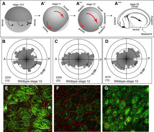 Figure 1. Apical Microtubules within Ectodermal Cells Orient during Gastrulation(A) The larval skin arises from the ectoderm (A, dark gray), an epithelium that covers the outside of the embryo during gastrulation (Aâ²â²; stage 12). During gastrulation (AâAâ²â²), the ectodermal epithelium is strained by the involuting mesoderm along an axis (red arrows) that aligns with the embryonic A-P axis. Events occurring during gastrulation are thought to set the axis and direction of ciliary flow (Aâ²â²â², arrow) that appears at stage 23, when MCCs differentiate.(BâD) Microtubule orientation was determined by tracking the movement of Clip170-GFP foci in nonneural ectodermal cells in wild-type embryos before gastrulation (B, stage 10), at blastopore closure (C, stage 12), or approximately 4 hr later (D, stage 15). The A-P axis is marked, and the number of traces and embryos used for each plot is denoted in the lower left corner. The numbers on the rose plot indicate the ratio.(E) Wild-type embryos injected with RNA encoding EMTB-3ÃGFP and mRFP to label MTs and membranes, respectively, were treated with 5 μμ Taxol at stage 10 for 6 hr and then fixed. Shown is a typical confocal image taken of cells located in the middle region of the ectoderm. The scale bar represents 20 μm.(F and G) Ectodermal explants were isolated from stage 10 embryos injected with RNA encoding EMTB-3ÃGFP and mRFP and treated with 5 μM Taxol until the equivalent of stage 12 (F) or stage 20 (G). Shown are typical confocal images at the apical surface.