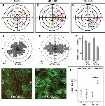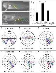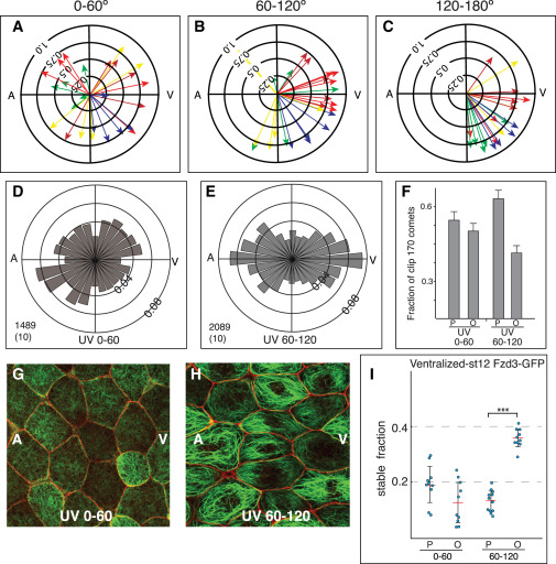 Figure 3. Planar Cell Polarity in Ventralized Embryos(AâC) Polar plots summarizing cilia orientation at stage 29 in ventralized embryos, based on their location along the An-Vg axis, where the animal (A) and vegetal (V) poles are set to 0° and 180°, respectively. Each arrow represents an MCC, where arrow direction denotes the mean polar direction of all basal bodies within that cell, and arrow length equals 1 minus the variation around the mean. Arrows of the same color represent data from the same embryo.(D and E) Shown are rose plots summarizing MT orientation in ventralized embryos at stage 12 as in Figure 1. Data are shown for cells located near the animal pole (0â60) or in the middle portion of the embryo along the An-Vg axis (60â120). The An-Vg axis is marked, and the number of traces and embryos used for each plot is denoted in the lower left corner.(F) Fraction of MTs oriented parallel or orthogonal to the An-Vg axis, based on data in (D) and (E). The error bars represent SD.(G and H) Ventralized embryos injected with RNA encoding EMTB-3ÃGFP and mRFP to label MTs and membranes, respectively, were treated with 5 μM Taxol at stage 10 for 8 hr and then fixed. Shown are typical confocal images taken of cells at the animal pole (G) or in the region 60â120 (H). The An-Vg axis is marked.(I) Stable fraction of Fzd3-GFP based on FRAP of cell junctions in ventralized embryos at stage 12, subdivided into those oriented parallel or orthogonal to the An-Vg axis, or located within a midregion (60â120) or at the animal pole (0â60). Asterisks denote significant differences based on the results of a two-paired t test (âââp < 0.001). Red and black bars indicate the mean and SD, respectively.