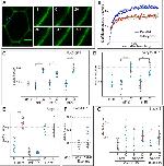 Figure 2. FRAP Analysis of PCP Proteins in the Xenopus Ectoderm(A) The fluorescence intensity of Fzd3-GFP was measured after photobleaching, assaying a segment (arrowhead in blue box) of the plasma membrane of outer epithelial cells at stage 12. Small images show Fzd3-GFP signal before and after bleaching (s). The scale bar represents 10 μm.(B) Plot showing the recovery of Fzd3-GFP fluorescence at 1-s intervals after bleaching of a junction oriented parallel (blue) and orthogonal (red) to the A-P axis. The data are fitted to a model previously described [28] to calculate a fitted curve as indicated with a 95% confidence window that was then used to represent a single data point in (C)â(G).(C and D) Plots shown summarize the stable fraction of Fzd3-GFP and Vangl2-GFP in ectodermal cells at stage (st)10 (Figure 1A), stage 12 (Figure 1Aâ²â²), stage 16 (early neurulae), and stage 22 (for Fzd3-GFP only). Measurements made at stage 12 and greater were assigned to cell-cell junctions oriented parallel (P) or orthogonal (O) to the A-P axis, whereas those at stage 10 fell into one group regardless of cell-cell junction orientation.(E) Plots shown summarize the stable fraction of Celsr1-GFP, mRFP, and Cdh3-GFP in wild-type embryos at junctions lying parallel or orthogonal to the A-P axis at stage 12.(F) Plots shown summarize the stable fraction of Fzd3-GFP at junctions in ectoderm explanted at stage 10 and cultured to stage 12 or stage 20. Also see Figure 7D.(G) Plots shown summarize the stable fraction of Fzd3-GFP and Vangl2-GFP in celsr1 morphants, or of Vangl2-GFP in fzd3 morphant (MO), at junctions lying parallel or orthogonal to the A-P axis at stage 12.Asterisks indicate the significance of individual results from a two-paired t test (ââp ⤠0.01, âââp ⤠0.001). Red and black bars indicate the mean and SD, respectively.