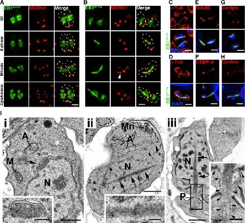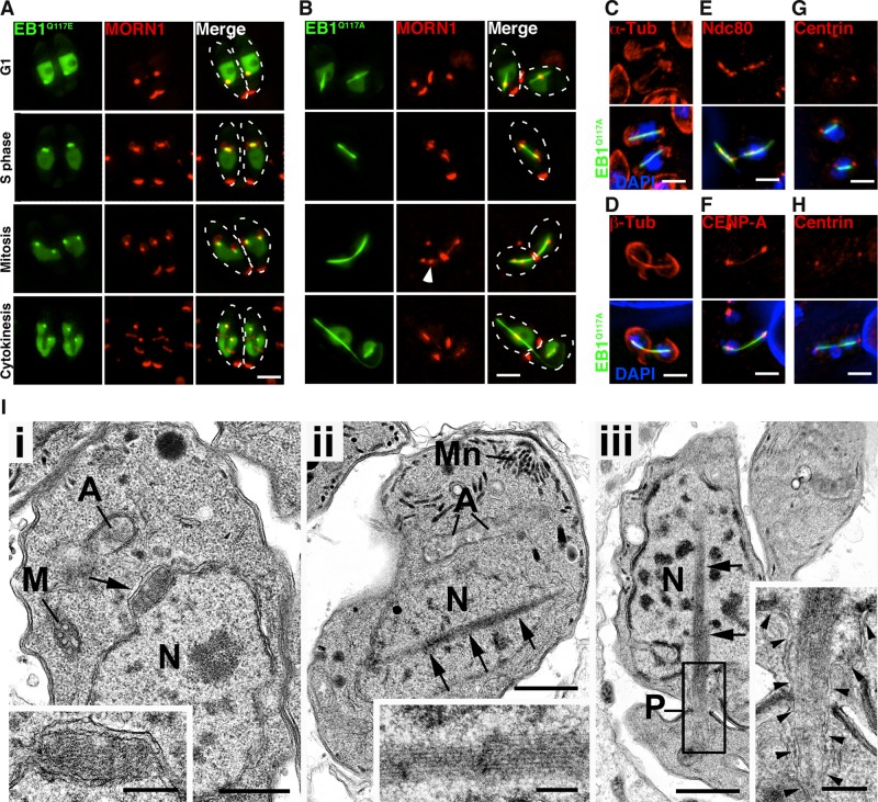 FIGURE 5:. EB1 mutants display distinct MT-interacting affinity. (A) TgEB1Q117E-YFP reduces affinity to the nuclear spindle MTs. Parasites stably expressing mCherryRFP-MORN1 were transiently cotransfected with a TgEB1Q117E-YFP–expressing construct and imaged live 24 h posttransfection. Dashed white lines outline the parasites. The cell division cycle progresses from top to bottom, and phases are as indicated on the left (B) TgEB1Q117A-YFP promotes formation of an abnormal bar-like structure. Parasites stably expressing mCherryRFP-MORN1 were transiently cotransfected with a TgEB1Q117A-YFP–expressing construct and imaged live 24 h posttransfection. White arrowhead indicates the ruptured centrocone. (C–H) Wild-type parasites were transiently transfected with a TgEB1Q117A-YFP–expressing construct and fixed 24 h after transfection. Parasites are stained with antisera against α-tubulin (C), β-tubulin (D), Ndc80 (E), CENP-A (F), and centrin (G, H). (C, D) The aberrant bar is composed of microtubules. (E, F) The aberrant bar disrupts clustered kinetochore complex. (G, H) The aberrant bar is bundled in between centrosomes. Bars, 3 μm. (I) Transmission electron microscopy of wild-type (i) and TgEB1Q117A-YFP–expressing parasites (ii, iii). Bars, 500 nm (main images), 100 nm (insets). (i) WT parasite, illustrating the nucleus (N) with the small eccentric spindle (arrow). Inset, enlargement of the nuclear spindle, showing that it is enclosed by the nuclear membranes. A, apicoplast; M, mitochondrion. (ii) TgEB1Q117A-YFP parasite exhibiting a rod-like structure (arrows) running through the nucleus (N). Inset, enlargement of the rod, showing the tightly packed microtubules lying naked in the nucleoplasm. A, apicoplast; Mn, micronemes. (iii) Mutant parasite showing the rod-like structure (arrows) running through the nucleus (N) and extending into the cytoplasm, passing through a posterior pore-like structure (P). Inset, enlargement of the enclosed area, showing the nuclear membranes extending over the protruding rod (arrowheads). |