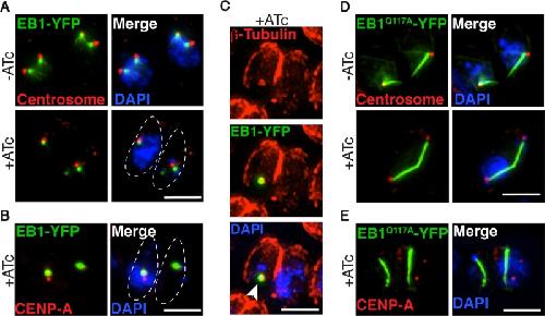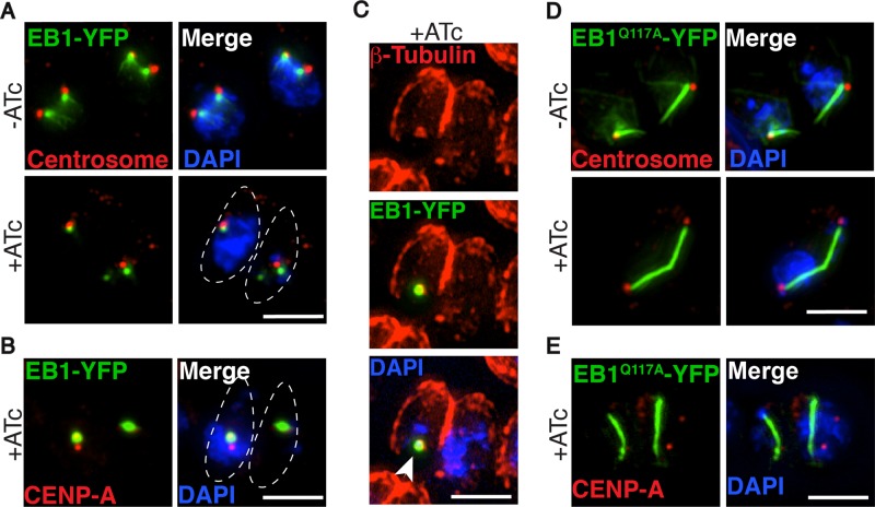 FIGURE 7:. Fate of the spindle in absence of the Ndc80 complex. TgEB1-YFP constructs were transiently transfected into the TgNuf2-cKD parasite line, seeded into HFF cells, and analyzed with and without ATc for 12 h. Dashed white lines outline the parasites (scale bar, 3 μm). (A, B) TgEB1WT-YFP remains associated with the centrosome in the absence of TgNuf2. TgEB1WT-YFP costained with either Centrin to mark the centrosome (A) or CENP-A antisera to mark the centromeres (B). (C) TgEB1WT-YFP associates with spindle MTs, indicated by costained β-tubulin antiserum. The white arrowhead marks the remnant of the centrocone (spindle pole) in an anucleate cell. (D, E) TgEB1Q117A-YFP–induced MT bundles failed to rescue chromosome segregation defects in the absence of TgNuf2. TgEB1Q117A-YFP costained with either HsCentrin to mark the centrosome (D) or CENP-A antiserum to mark the centromeres (E). Bar, 3 μm. |