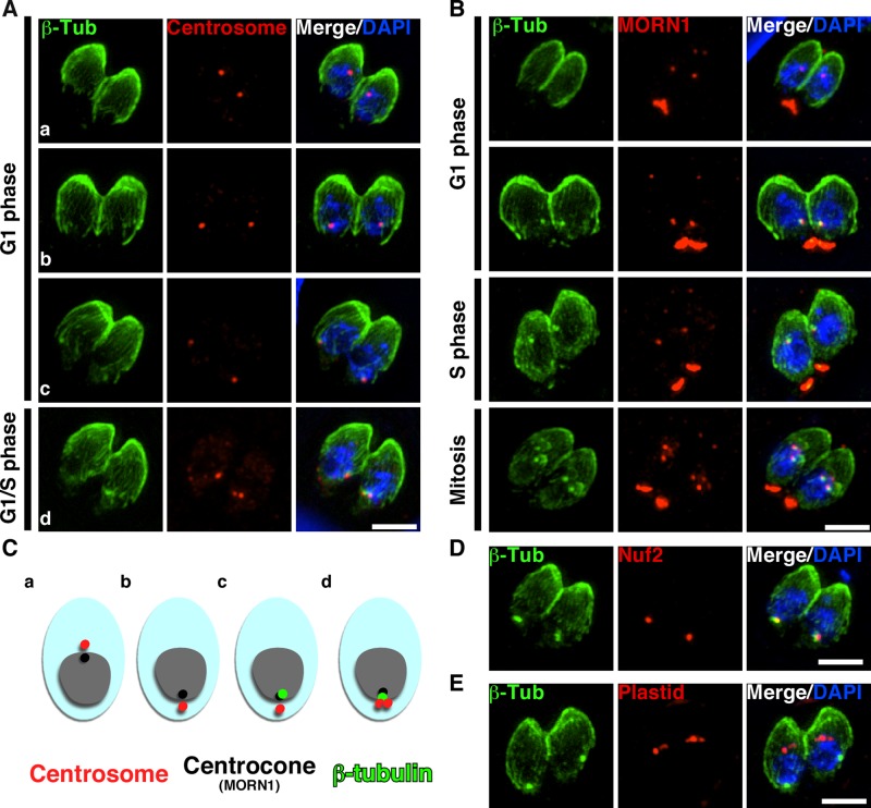 FIGURE 1:. Spindle MT assembly in space and time. (A) Spindle assembly initiates when the centrosome rotates to the basal side of the nucleus. Wild-type parasites expressing DDmyc-Centrin1 stabilized with Shield1 were costained with cMyc (marking the centrosome in red) and β-tubulin antisera. The cell division cycle progresses from top to bottom, and phases are as indicated on the left. (B) The centrocone rotates along with the spindle MT upon assembly at the basal end of nucleus. Parasites stably expressing myc2-MORN1 were costained with cMyc and β-tubulin antisera. The cell division cycle progresses from top to bottom, and phases are as indicated on the left. (C) Schematic representation of the results in A and B. The centrosome is marked in red, the centrocone (MORN1) in black, β-tubulin in green, and the nucleus in gray. The cell division cycle progresses from left to right (a to d). (D) The kinetochore complex corotates to the basal end of nucleus upon spindle assembly. Wild-type parasites were costained with β-tubulin and TgNuf2 antisera to highlight the assembled spindle and the kinetochore, respectively. (E) The plastid remains at the top of the nucleus, and the spindle assembles at the basal end of nucleus. Wild-type parasites were costained with β-tubulin antiserum and Alexa 594–conjugated streptavidin to mark the assembled spindle and the plastid, respectively. β-Tubulin staining is shown in green, and other markers are shown in red. Bar, 3 μm. |