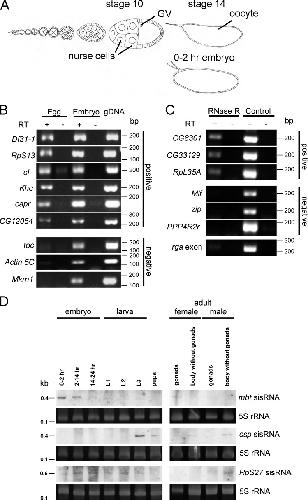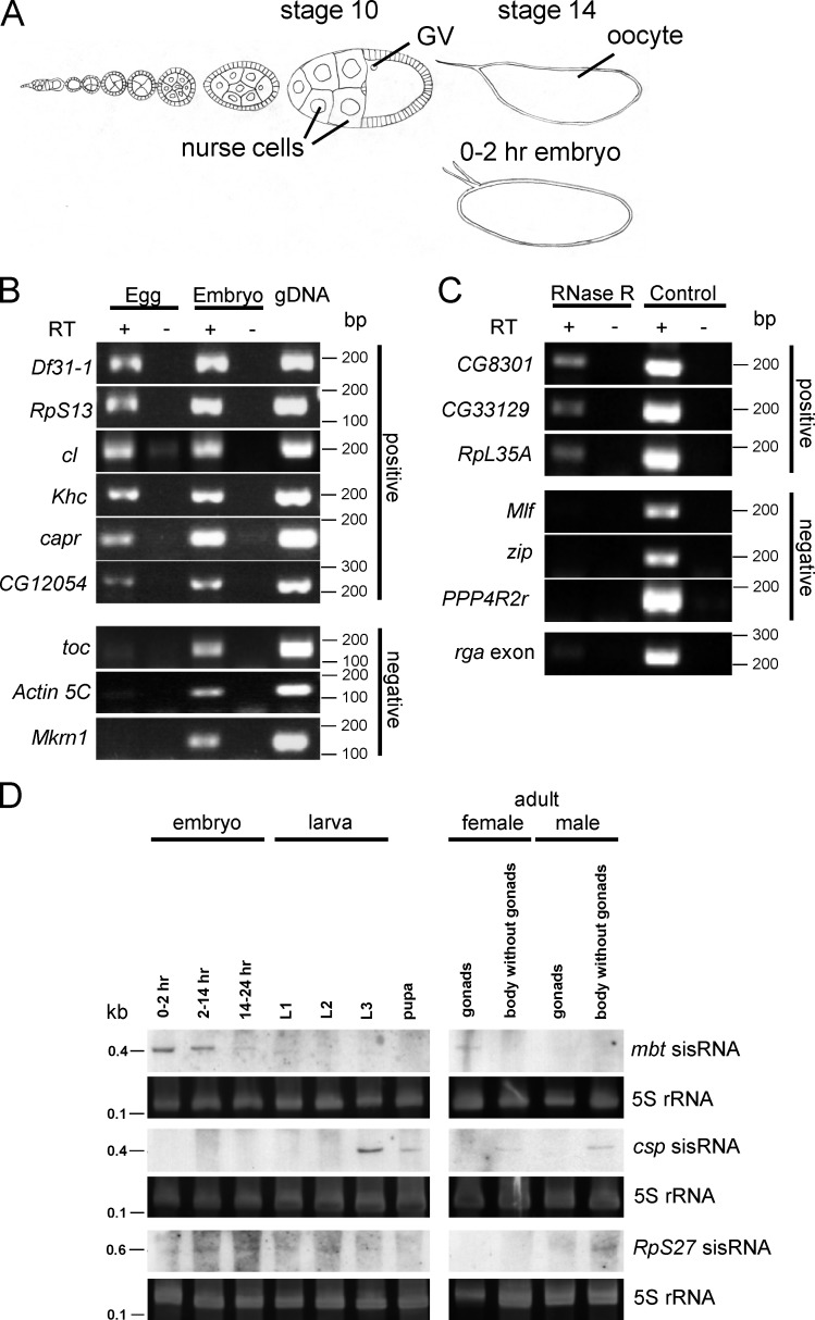 Figure 1. Identification of sisRNAs. (A) Diagram of an ovariole showing stages in the development of the oocyte and its accompanying nurse cells. Also shown is a 0–2-h embryo. GV, germinal vesicle. (B) RT-PCR showing expression of some sisRNAs in unfertilized eggs. (C) RT-PCR showing expression of some RNase R-resistant sisRNAs in unfertilized eggs. rga exon was used as a positive control for RNase R activity. (D) Northern blots showing expression of mbt, csp, and RpS27 sisRNAs during development and in adult somatic tissues and gonads. The gels were stained with SYBR Gold to visualize 5S rRNA as a loading control. L1, first instar larvae; L2, second instar larvae; L3, third instar larvae.