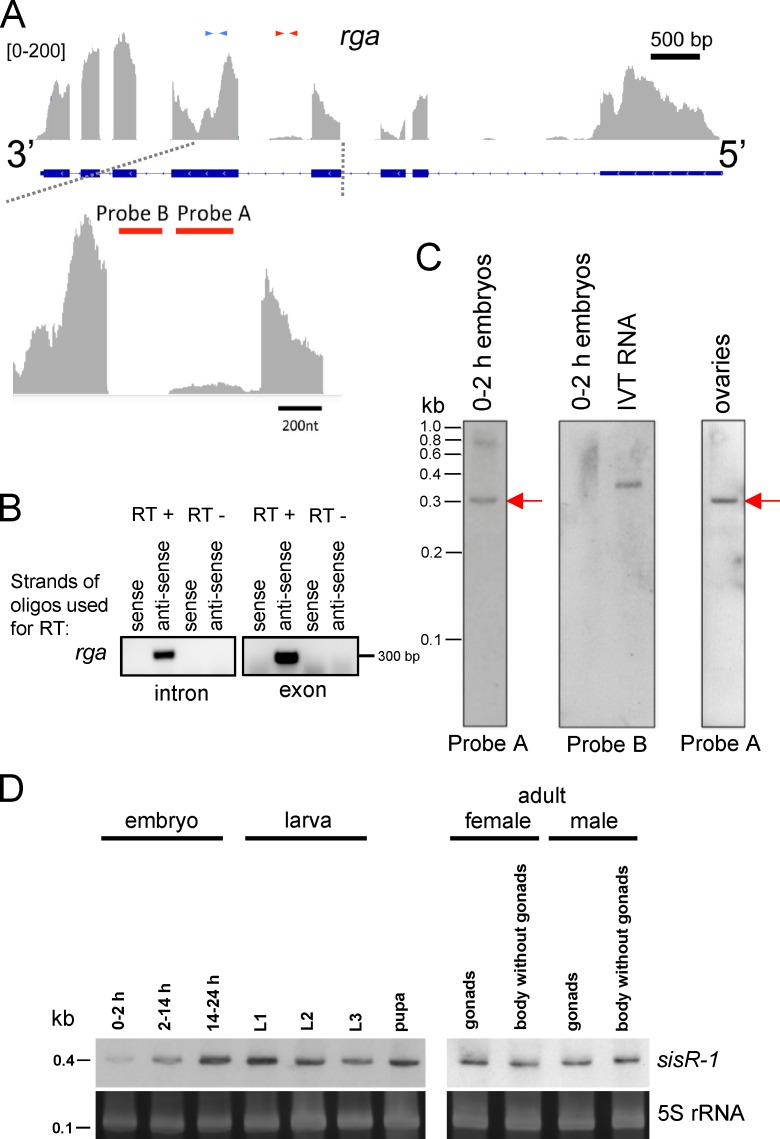 Figure 2. sisRNA (sisR-1) from the regena locus. (A) Genome browser view of exonic and intronic sequences in the rga locus. Blue and red arrows indicate exonic and intronic primers used for RT-PCR. The bottom panel shows an enlarged view of the intronic peak. Red bars indicate the regions to which probes A and B hybridize. (B) Strand-specific RT-PCR using primers in the intron and exon of rga. (C) Northern blots using probes A and B to detect expression of sisR-1 in 0–2 h embryos and ovaries are shown. A band of ∼300 nt was detected with probe A (red arrows). Probe B gave no detectable signal in RNA from 0–2-h embryos but did hybridize with 10 pg of in vitro transcribed (IVT) RNA. (D) Northern blots showing expression of sisR-1 during development and in adult somatic tissues and gonads. The gels were stained with SYBR Gold to visualize 5S rRNA as a loading control. L1, first instar larvae; L2, second instar larvae; L3, third instar larvae.