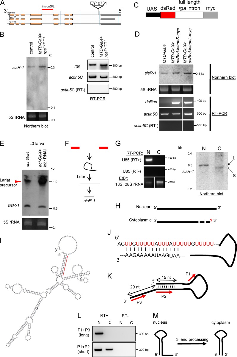 Figure 3. Processing of sisR-1. (A) Diagram showing the insertion of an EP element EY10731 used to overexpress the rga pre-mRNA. L, long; S, short. (B) A Northern blot showing expression of sisR-1 in the ovaries of controls versus rga overexpression flies. RT-PCR showing expression of rga mRNA and actin5C in the ovaries of controls versus rga overexpression flies. (C) Diagram showing the construct used to overexpress rga intronic sequences. (D) Northern blot showing expression of sisR-1 in ovaries of controls versus rga intronic sequence overexpression flies. RT-PCR verifies expression of dsRed mRNA in the ovaries of dsRed-intron-myc overexpression flies but not in controls. (E) Northern blots showing expression of sisR-1 in the controls versus ldbr RNAi third instar larvae. (F) Model for processing of sisR-1 from the rga pre-mRNA. (G) Northern blot showing detection of sisR-1 in both the nuclear (N) and cytoplasmic (C) fractions of 14–24-h embryos. RT-PCR showing the expression of U85 only in the nuclear fraction. EtBr staining showing the enrichment of 18S, 28S rRNA in the cytoplasmic fraction. RNAs were run on the same gel, and the intervening lanes were removed (white vertical lines). (H) Diagram showing the 5′ and 3′ ends of the nuclear and cytoplasmic sisR-1 determined by RACE. Question mark depicts unknown 3′ end of cytoplasmic sisR-1. (I) Predicted structure of nuclear sisR-1 by Vienna RNA fold software. Red dotted region is shown in J. (J) Magnified view of the dotted region in I shows the base pairing. (K) Diagram with red arrows to indicate regions where the primers anneal to. (L) RT-PCR showing the detection of the short, but not long, isoform of sisR-1 in the cytoplasmic fraction. (M) Model showing the processing of nuclear sisR-1 to cytoplasmic sisR-1 by 3′ end processing.