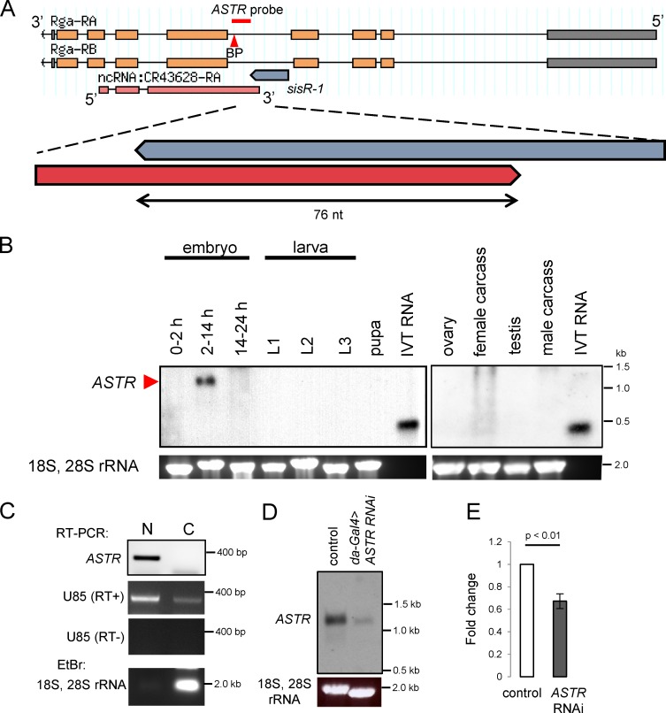 Figure 4. ASTRpromotes robust expression of rga pre-mRNA. (A) Genomic locus showing regions of rga, sisR-1, and ASTR. Red bar indicates the region where the ASTR probe binds. Red arrowhead points to a putative branch point (BP) CTAAT. (B) Northern blots showing expression of ASTR in 2–14-h embryos. In vitro transcribed (IVT) RNA was used as positive controls. The gels were stained with EtBr to visualize 18S, 28S rRNA as a loading control. (C) Strand-specific RT-PCR detecting the presence of ASTR in the nuclear but not the cytoplasmic fraction of 2–14-h embryos. RT-PCR showing the high expression of U85 in the nuclear fraction. EtBr staining showing the enrichment of 18S, 28S rRNA in the cytoplasmic fraction. (D) Northern blot showing the expression of ASTR in controls versus da-Gal4>ASTR RNAi 2–14-h embryos. The gel was stained with EtBr to visualize 18S, 28S rRNA as a loading control. (E) qPCR data showing relative expression of rga pre-mRNA normalized to actin5C in the controls versus da-Gal4>ASTR RNAi 2–14-h embryos. Error bars represent SD. n = 3. P-value represents t test.