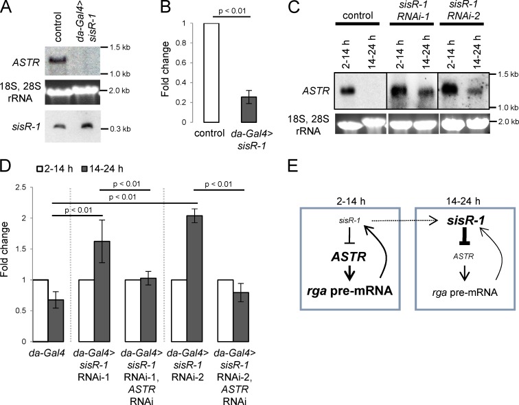 Figure 5. sisR-1promotes robust repression of ASTR. (A) Northern blot showing the expression of ASTR in controls versus da-Gal4>sisR-1 2–14-h embryos. (B) qPCR data showing relative expression of rga pre-mRNA normalized to actin5C in the controls versus da-Gal4>sisR-1 2–14-h embryos. Error bars represent SD. n = 3. P-value represents t test. (C) Northern blots showing expression of ASTR in controls versus embryos expressing sisR-1 shRNA. The gels were stained with EtBr to visualize 18S, 28S rRNA as a loading control. (D) qPCR data showing fold change of rga pre-mRNA expression (normalized to actin5C) from 2–14-h to 14–24-h embryos in controls versus sisR-1 RNAi versus sisR-1 RNAi + ASTR RNAi embryos. Error bars represent SD. n = 3. P-value represents t test. (E) Model for the regulatory relationship between sisR-1, ASTR, and rga pre-mRNA during embryogenesis.