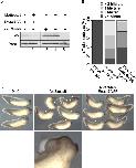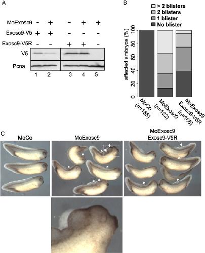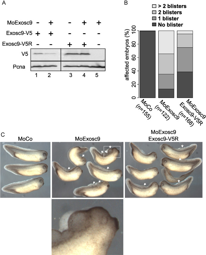 Fig. 1. ExosC9 morphant embryos specifically display dorsal skin blisters. (A) We injected two-cell embryos with the indicated molecules: morpholino targeting exosc9 mRNA (MoExosc9), mRNA encoding a V5-tagged Exosc9 (Exosc9-V5) and mRNA mutated on the morpholino recognition site encoding a V5-tagged Exosc9 (Exosc9-V5R). We allowed the embryos to develop until stage 26 to assess the accumulation of V5-tagged protein by western blot. Pcna is the loading control. (B) Photographs of stage 33 embryos previously injected with the indicated molecules. Arrows point to blisters. (C) The blister phenotype was scored according to the number of dorsal blisters. The number of embryos scored for each experimental condition is indicated under the graph.