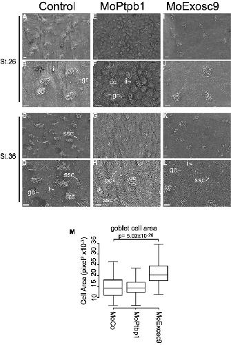 Fig. 4. Scanning Electron Microscopy (SEM) analysis of the peridermal layer of ptbp1 and exosc9 morphant embryos. (AâL) Stage 26 (A, B, E, F, I, J) and stage 36 (C, D, G, H, K, L) embryos, previously injected with MoPtbp1 or MoExosc9 or left uninjected (control) as indicated, were fixed, dehydrated and processed for SEM. The four cell types described in the Xenopus mucociliary epithelium are indicated as ionocytes (i), goblet cells (gc), ciliated cells (cc) and small secretory cells (ssc). (M) The apical area of the goblet cells was measured in stage 36 embryos (MoCo 262 cells, 4 embryos; MoPtbp1 131 cells, 3 embryos; MoExosc9 168 cells, 4 embryos). The scale bar shown on pictures represents 10 µm (A, C, E, G, I, K) or 100 µm (B, D, F, H, J, L). Abbreviations: dorsal fin (df), eye (e), blister (bl).
