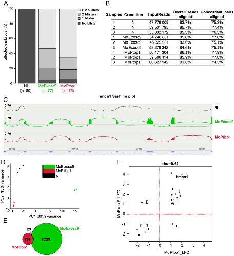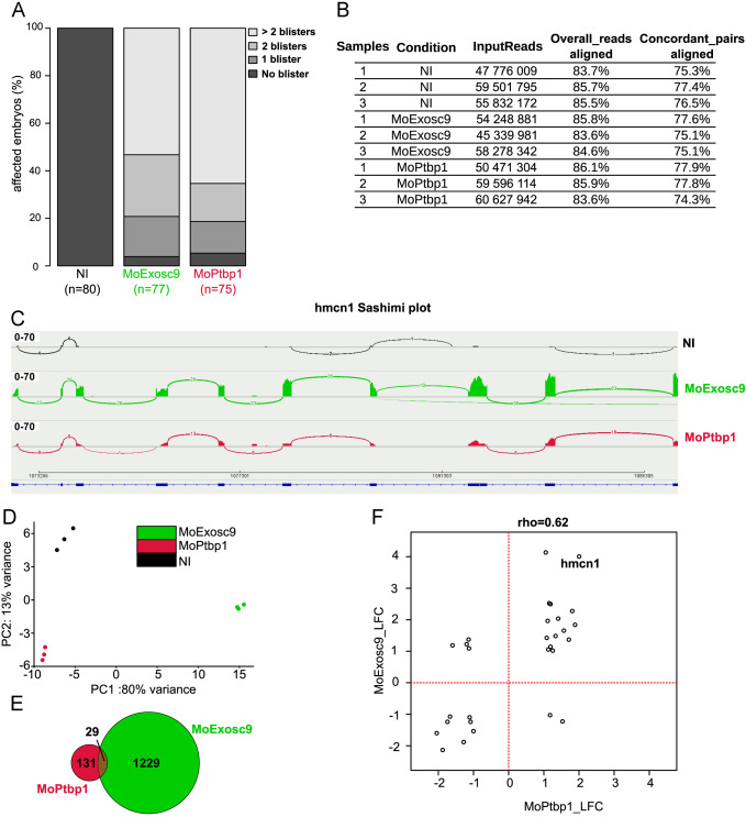 Fig. 5. Transcriptome analysis. (A) Scoring of the blister phenotypes obtained in stage 36 embryos, the siblings of those used to prepare the RNA sequencing libraries. The number of scored embryos is indicated below the categories. (B) Unstranded poly(A)+ RNA sequencing libraries were prepared from biological triplicates of pools of 10 embryos either non-injected (NI), or injected with MoPtbp1 or MoExosc9. Sequencing generated 2Ã101 nt paired reads. The total number of reads obtained (InputReads), the percentage of reads aligned (Overall_read_aligned) and of concordant pairs of reads aligned for each sample is indicated. (C) Example of a Sashimi plot representing read coverage across the hmcn1 locus in the three experimental conditions (samples 1). (D) Principal component analysis of the nine samples discriminates between the experimental conditions. (E) Venn diagram showing the overlap between differentially expressed genes (BH-adjusted pvalue <0.05 and at least twofold fold changes) in ptbp1 and exosc9 morphants. (F) Log 2 fold changes (LFC) are presented for genes differentially expressed in ptbp1 and exosc9 morphant embryos.