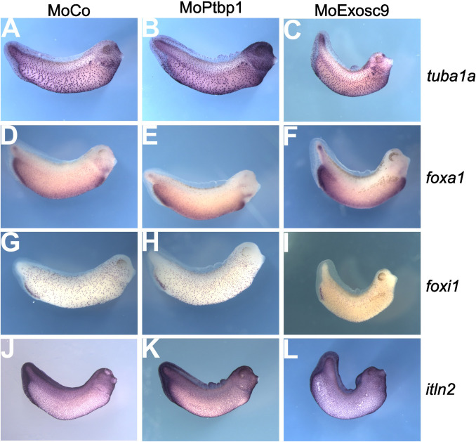 Fig. 2. In situ hybridization for epidermal markers in exosc9 and ptbp1 morphants. Albino embryos were injected with the control morpholino (MoCo, A, D, G, J), MoPtbp1 (B, E, H, K) or MoExosc9 (C, F, I, L) in both blastomeres. Embryos were fixed at stage 32 and processed for in situ hybridization with the following probes: tuba1a (AâC), foxa1 (DâF), foxi1 (GâI) and itln2 (JâL).