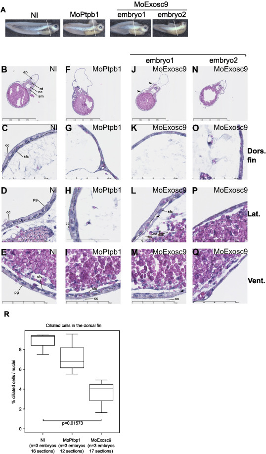 Fig. 3. Histological comparison of ptbp1 and exosc9 morphant embryos. Embryos were injected with MoPtbp1 or MoExosc9 in both blastomeres, fixed at stage 40 and processed for histological analysis. (A) Macroscopically, ptbp1 and exosc9 morphant embryos displayed similar blister structures on the dorsal side. (BâQ) 5 µm transversal sections from the embryos presented in A (section plans shown by white line) and stained with hematoxylin/eosin. Detailed images of the dorsal fin (C, G, K, O), and the lateral (D, H, L, P) and ventral (E, I, M, Q) epidermis were shown for each embryo as indicated. Abbreviations: epidermis (ep), neural tube (nt), notochord (nc), somite (sm), sensorial layer cells (slc), ciliated cells (cc) and pigment granule (pg). The scale bar is shown for each image (100 µm, except B, F, J, N 1 mm). Arrowhead points to gap between slc and periderm layer. R) Cells harboring cilia were counted in the dorsal epithelium and normalized to the number of nuclei observed. The number of embryos and sections counted is presented below each barplot.