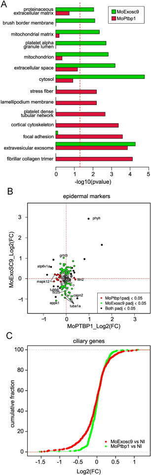 Fig. 6. Post-transcriptional networks of Ptbp1 and Exosc9 in epidermis biology. (A) Comparison of enriched GO terms in differentially expressed genes in ptbp1 and exosc9 morphants. The dotted red line indicates p=0.05. (B) Comparison of the fold change in exosc9 (MoExosc9_Log2(FC)) and ptbp1 (MoPtbp1_Log2(FC)) morphant embryos for genes encoding epidermal markers ( Chalmers et al., 2006 and Hayes et al., 2007). Genes significantly (p<0.05 corrected for multiple testing) differentially expressed in ptbp1 morphants are shown in red, those significantly differentially expressed in exosc9 morphants are shown in green and those significantly differentially expressed in both morphants are shown in black. (C) Cumulative distribution of the Log2 fold-change of ciliary genes following Exosc9 depletion (green) and Ptbp1 depletion (red), compared with the non-injected embryos. Differential expression of ciliary genes in exosc9 and ptbp1 morphant embryos.