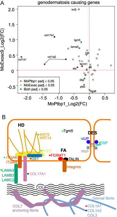 Fig. 7. Differential expression of genodermatosis-causing genes. (A) Comparison of the fold changes in exosc9 (MoExosc9_Log2(FC)) and ptbp1 (MoPtbp1_Log2(FC)) morphant embryos for genes causing genodermatosis in humans. (B) Schematic diagram of the dermal-epidermal junction in relation to genes differentially expressed upon Ptbp1 or Exosc9 depletion. Genes significantly (p<0.05 corrected for multiple testing) differentially expressed in ptbp1 morphants are highlighted with a red dot, those significantly differentially expressed in exosc9 morphants with a green dot and those significantly differentially expressed in both morphants with a black dot. Abbreviations: HD, hemidesmosome; FA, focal adhesion; DES, desmosome.