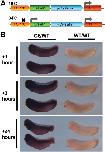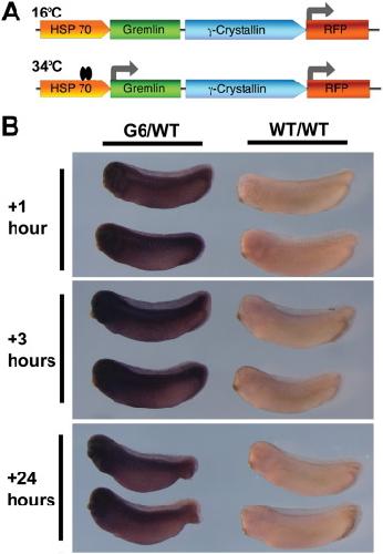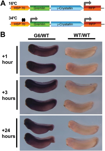 Fig. 2. Inducible expression of grem1 in a stable transgenic line. A) Schematic of the transgene used. At ambient temperatures, grem1 transcription is not expected, but when the temperature is increased, triggering the heat shock proteins to bind to the Hsp70 promoter, grem1 is transcribed in all cells. RFP driven by the lens specific γ-crystallin promoter is always present acting as a visible marker for transgene presence. B) In situ hybridisation for grem1 transcripts in heterozygote and wild type offspring of the G6 male founder. Heat shock was applied for 30 min at stage 30 and the tadpoles fixed after 1 or 3 h, or at stage 15 and fixed after 24 h. Grem1 is overexpressed strongly in G6 F1 tadpoles, so staining reactions for all tadpoles were terminated at the same time, when endogenous grem1 is only just detectable in the WT siblings ( Hsu et al., 1998 and Pearl et al., 2008). Note that a phenotype, similar to that seen with Noggin overexpression, develops in embryos heat shocked at stage 15, and presumably results from BMP inhibition.